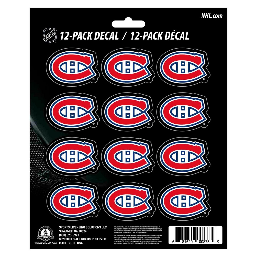 | Montreal Canadiens 12 Count Mini Decal Sticker Pack Includes12 small size decals on a 5in x 6in sheet Adhesive decals are die-cut to shape Printed on premium vinyl material UV resistant lamination for outstanding durability Great for cars, laptops, coolers and other hard surfaces Approximately 5in x 6.25in NHL - Montreal Canadiens in Quebec NHL National Hockey League |