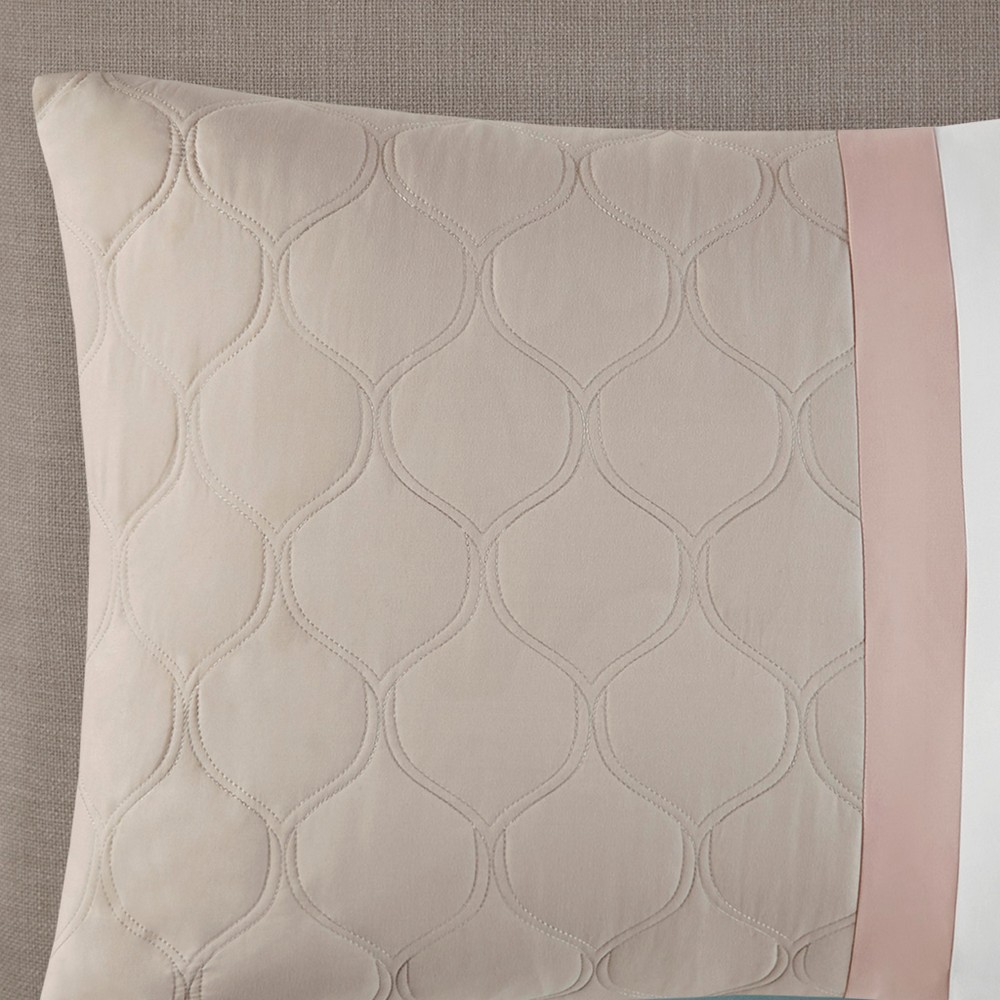 | 510 Design King 1 Comforter: 104"W x 92"L 2 King Shams: 20"W x 36"L (2) 1 Bedskirt: 78"W x 80"L +15"D 2 Euro Shams: 26"W x 26"L + 2" (2) 1 Decorative Pillow: 12"W x 18"L 1 Decorative Pillow: 18"W x 18"L Comforter and shams: 100% polyester microfiber face and reverse, print details pieced with quilting, 6 oz/sq yard polyester filling Bedskirt: 100% polyester microfiber drop, non-woven platform Pillows and Euro shams: 100% polyester microfiber, 100% polyester pillow filling Transitional Style Includes 8 Piece(s) Machine Washable Spot Clean Pillows Update your bedroom with the refined elegance of 510 Design’s Shawnee 8 Piece Comforter Set. Showcasing a pieced design with diamond quilting details, this ultra-soft microfiber comforter flaunts a partial damask print in blush and taupe hues to create a luxurious look. A solid reverse complements the top of the bed, while the matching shams reiterate the design of the comforter for a chic coordinated ensemble. The blush Euro shams feature taupe flanges that add a charming touch and two embroidered decorative pillows provide a lavish accent. Completing the comforter set is a solid bed skirt that offers a clean finish, giving your bedroom decor a beautiful allure. Hypoallergenic polyester filling in the comforter and pillows contains no allergens and is treated to be dustproof. Machine washable for easy care, this traditional comforter set may come in rolled or compressed packing and will need to be fluffed up. Use a steam iron to help remove wrinkles easier. |