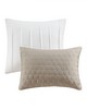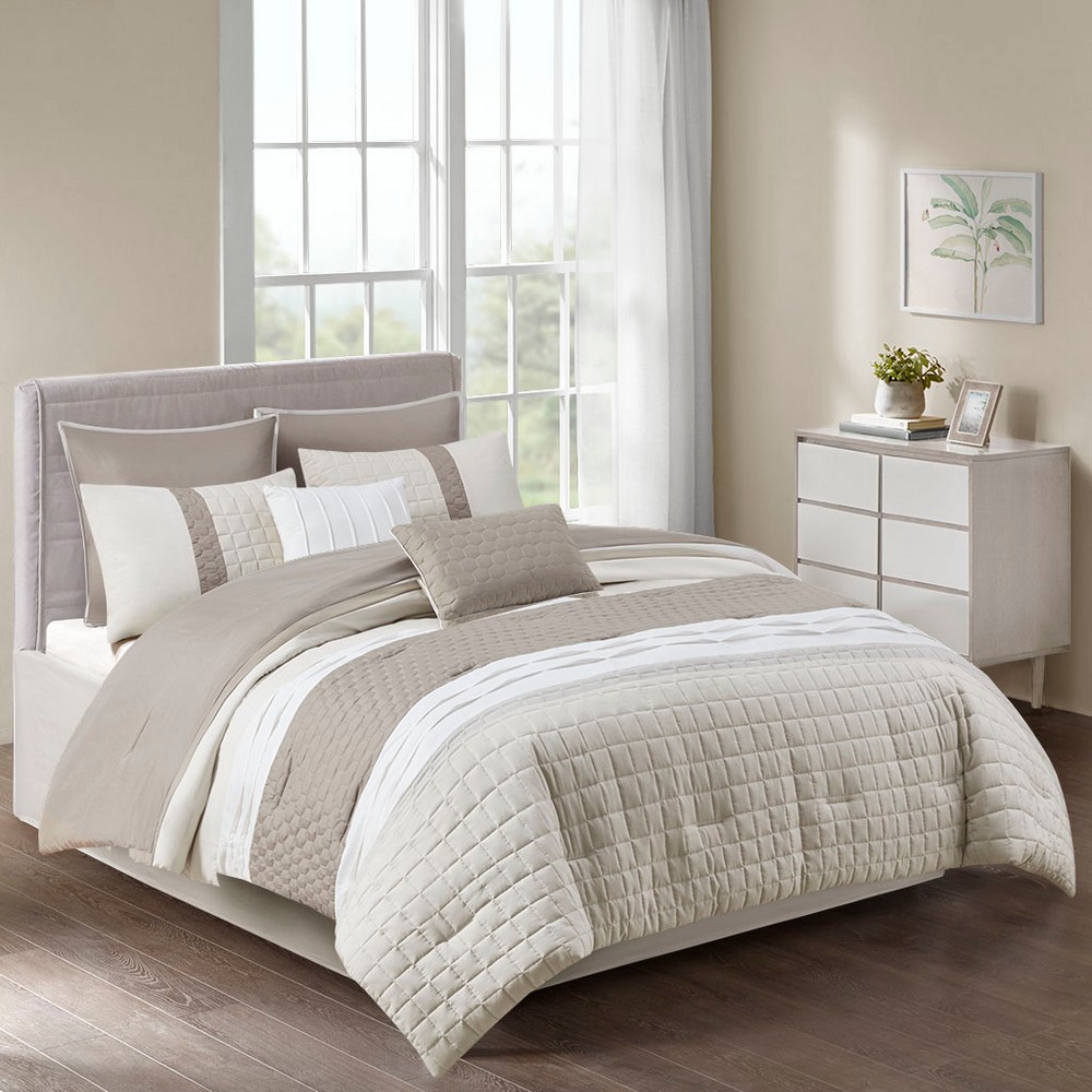 | 510 Design King 1 Comforter: 104"W x 92"L 2 King Shams: 20"W x 36"L (2) 1 Bedskirt: 78"W x 80"L +15"D 1 Decorative Pillow: 12"W x 18"L 1 Decorative Pillow: 18"W x 18"L 2 Euro Shams: 26"W x 26"L (2) Soft microfiber face and reverse comforter, pintuck details pieced with quilting, 6 oz/sq yard polyester filling; microfiber bed skirt, pillows and euro shams Transitional Style Includes 8 Piece(s) Machine Washable Spot Clean Pillows Add a warm and inviting new look to your bedroom with the 510 Design Tinsley 8 Piece Comforter Set. Made from ultra-soft microfiber, this comforter flaunts a pieced design with pleated accents that add dimension and charm. Quilting and pintuck details create a beautiful textural look and feel, while a solid reverse complements the top of the bed. The 2 coordinating shams reflect the design of the comforter and Euro shams with white flanges complete the chic ensemble. Also included are 2 decorative pillows and a solid bed skirt that provide the perfect finishes to the neutral bedding set. Machine washable for easy care, this quilted comforter set may come in rolled or compressed packing and will need to be fluffed up. Use a steam iron to help remove wrinkles easier. |
