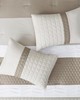 | 510 Design Cal King 1 Comforter: 104"W x 92"L 2 King Shams: 20"W x 36"L (2) 1 Bedskirt: 72"W x 84"L+15"D 1 Decorative Pillow: 12"W x 18"L 1 Decorative Pillow: 18"W x 18"L 2 Euro Shams: 26"W x 26"L (2) Soft microfiber face and reverse comforter, pintuck details pieced with quilting, 6 oz/sq yard polyester filling; microfiber bed skirt, pillows and euro shams Transitional Style Includes 8 Piece(s) Machine Washable Spot Clean Pillows Add a warm and inviting new look to your bedroom with the 510 Design Tinsley 8 Piece Comforter Set. Made from ultra-soft microfiber, this comforter flaunts a pieced design with pleated accents that add dimension and charm. Quilting and pintuck details create a beautiful textural look and feel, while a solid reverse complements the top of the bed. The 2 coordinating shams reflect the design of the comforter and Euro shams with white flanges complete the chic ensemble. Also included are 2 decorative pillows and a solid bed skirt that provide the perfect finishes to the neutral bedding set. Machine washable for easy care, this quilted comforter set may come in rolled or compressed packing and will need to be fluffed up. Use a steam iron to help remove wrinkles easier. |