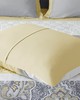 | 510 Design Cal King 1 Comforter: 104"W x 92"L 2 King Shams: 20"W x 36"L(2) 1 Bedskirt: 72"W x 84"L + 15"D 2 Euro Shams: 26"W x 26"L + 2"D(2) 1 Decorative Pillow: 12"W x 18"L 1 Decorative Pillow: 18"W x 18"L Comforter and shams: 100% polyester microfiber face and reverse, print details pieced with quilting, 6 oz/sq yard polyester filling Bedskirt: 100% polyester microfiber drop, non-woven platform Pillows and Euro shams: 100% polyester microfiber, 100% polyester pillow filling Transitional Style Includes 8 Piece(s) Machine Washable Spot Clean Pillows Update your bedroom with the refined elegance of 510 Design’s Shawnee 8 Piece Comforter Set. Showcasing a pieced design with diamond quilting details, this ultra-soft microfiber comforter flaunts a partial damask print in yellow, grey, and taupe hues to create a luxurious look. A solid yellow reverse complements the top of the bed, while the matching shams reiterate the design of the comforter for a chic coordinated ensemble. The grey Euro shams feature yellow flanges that add a charming touch and 2 embroidered decorative pillows provide a lavish accent. Completing the comforter set is a solid grey bed skirt that offers a clean finish, giving your bedroom a beautiful allure. Hypoallergenic polyester filling in the comforter and pillows contains no allergens and is treated to be dustproof. Machine washable for easy care, this traditional comforter set may come in rolled or compressed packing and will need to be fluffed up. Use a steam iron to help remove wrinkles easier. |