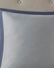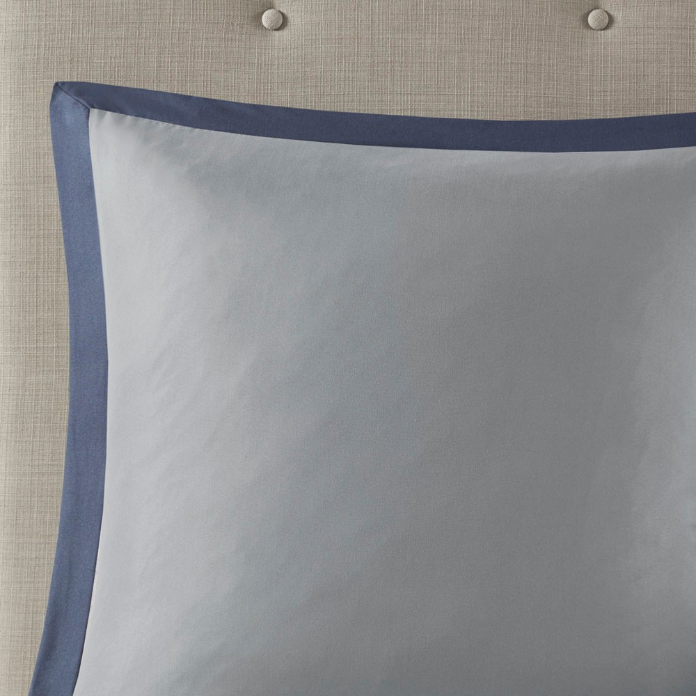 510 Design presents the Powell 8 Piece Embroidered Comforter Set to elevate your bedroom decor. This hotel style navy comforter features an embroidered and pieced border for a sophisticated and elegant design that easily coordinates with your space. The matching pillow shams also flaunt beautiful embroidery details, while the grey Euro shams are accented with graceful navy flanges to complete the transitional look. A solid navy bedskirt and 2 decorative pillows with embroidered details add the finishing touches to this hotel style bedding set. Hypoallergenic polyester filling in the comforter and pillows contains no allergens and is treated to be dustproof. Machine washable for easy care, this embroidered comforter set may come in rolled or compressed packing and will need to be fluffed up. Use a steam iron to help remove wrinkles easier.