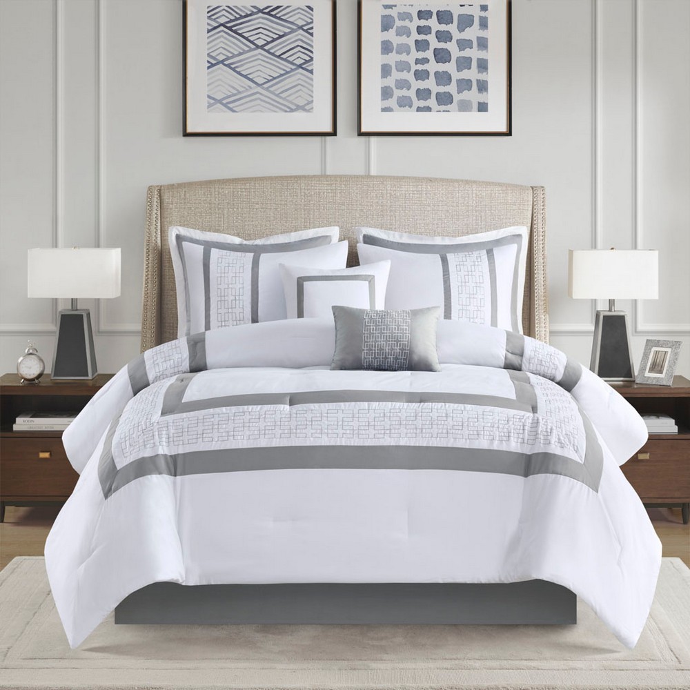 | 510 Design King 1 Comforter: 104"W x 92"L 2 King Shams: 20"W x 36"L (2) 1 Bedskirt: 78"W x 80"L +15"D 1 Decorative Pillow: 12"W x 16"L 1 Decorative Pillow: 18"W x 18"L 2 Euro Shams: 26"W x 26"L (2) Comforter and shams: 100% polyester microfiber, pieced with embroidered face and microfiber reverse, 6 oz/sq yard polyester filling Bedskirt: 100% polyester microfiber drop, non-woven platform Pillow: 100% polyester microfiber cover, 100% polyester filling, Euro sham: 100% polyester microfiber Modern/Contemporary Style Includes 8 Piece(s) Machine Washable Spot Clean Pillows 510 Design presents the Powell 8 Piece Embroidered Comforter Set to elevate your bedroom decor. This hotel style white comforter features an embroidered and pieced border for a sophisticated and elegant design that easily coordinates with your space. The matching pillow shams also flaunt beautiful embroidery details, while the grey Euro shams are accented with graceful white flanges to complete the transitional look. A solid grey bedskirt and 2 decorative pillows with embroidered details add the finishing touches to this hotel style bedding set. Hypoallergenic polyester filling in the comforter and pillows contains no allergens and is treated to be dustproof. Machine washable for easy care, this embroidered comforter set may come in rolled or compressed packing and will need to be fluffed up. Use a steam iron to help remove wrinkles easier. |