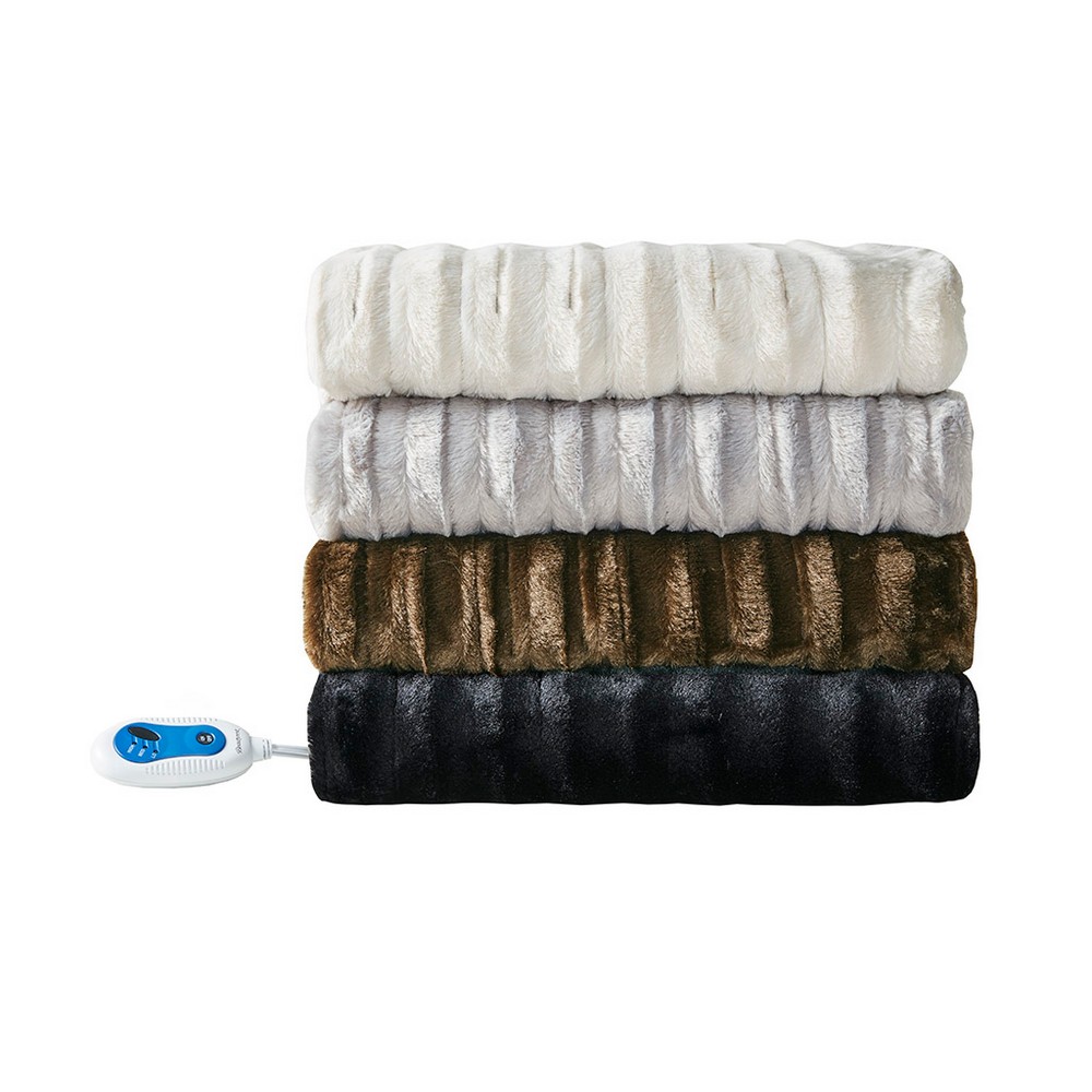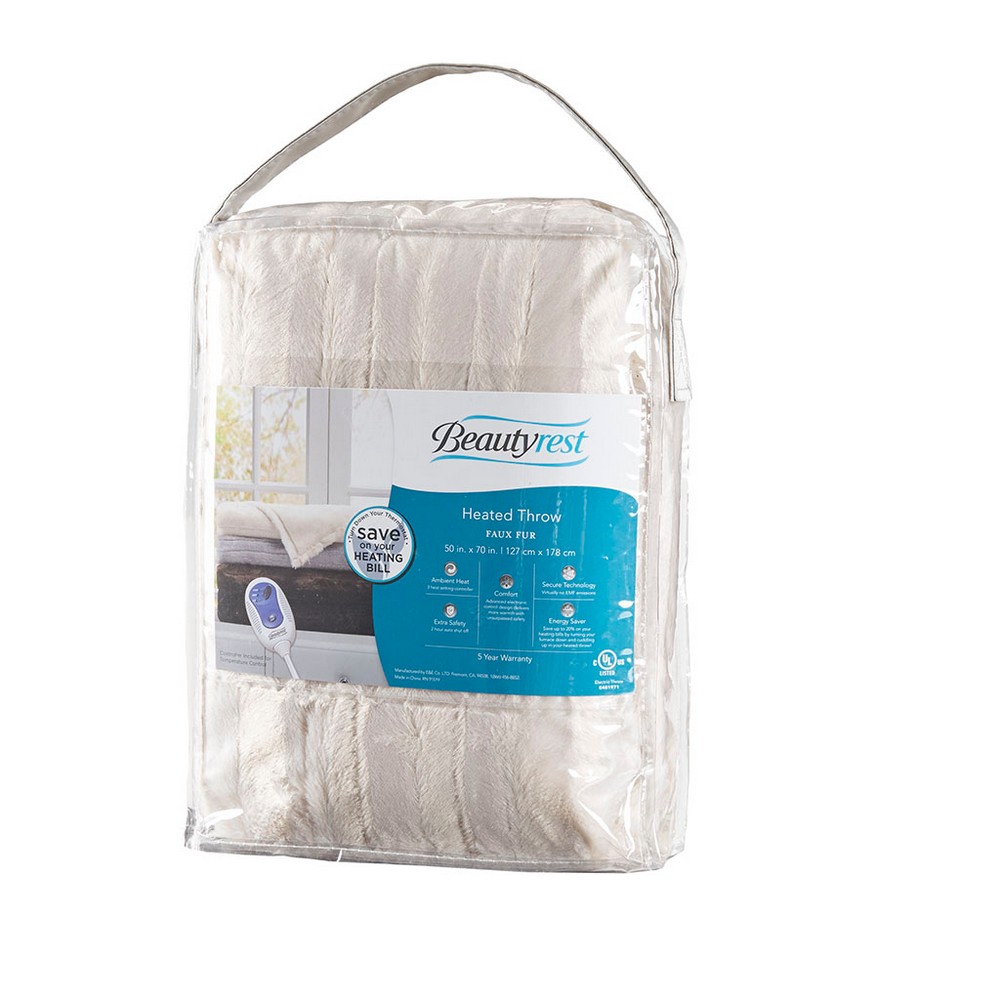 | Beautyrest 50x70" 1 Throw: 50x70" face: solid brushed long fur, 300gsm, 100% polyester; back: solid long fur, 260gsm, 100% polyester Glam/Luxury Style Includes 1 Piece(s) MACHINE WASH COLD, GENTLE CYCLE, AND SEPARATELY. DO NOT BLEACH. TUMBLE DRY LOW, REMOVE PROMPTLY. DO NOT IRON. IF THERE IS NO FREE MOVEMENT IN THE WASHER OR DRYER, USE LARGE CAPACITY COMMERCIAL WASHER/DRYER. Our heated throw utilizes state of the art Secure Comfort heated technology that adjusts the temperature of your throw based on overall temperature, spot temperatures and the ambient temperature of your room, ensuring a consistent flow of warmth. This unique technology also emits virtually no electromagnetic field emissions, so you can snuggle up with confidence. This throw is oversized, nearly a foot larger in the length and width compared to standard heated throws. The ultra soft faux fur creates a cozy, comfortable throw. Featuring 3 heat settings, this throw is machine washable for easy care and OEKO-TEX certified, meaning it does not contain any harmful substances or chemicals to ensure quality comfort and wellness. Includes manufacturer’s 5-year warranty. |