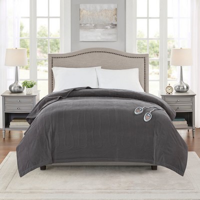 | Beautyrest Twin 1 Heated Blanket: 62"W x 84"L 100% polyester textured micro fleece face, 100% polyester solid micro fleece reverse Casual Style Includes 1 Piece(s) Machine wash cold, gentle cycle, and separately. Do not bleach. tumble dry low, remove promptly. do not iron. If there is no free movement in the washer or dryer, use large capacity commercial washer/dryer Nestle into our Beautyrest Electric Micro Fleece Heated Blanket with Secure Comfort Technology. Designed to virtually eliminate Electro Magnetic Field emissions, this electric blanket features a 10-hour auto shut-off timer and a 20 setting temperature control to ensure your safety. Soft flexible wires and ultra-soft micro fleece fabric provides exceptional comfort and warmth. Machine washable for easy care, this heated blanket is OEKO-TEX certified, meaning it does not contain any harmful substances or chemicals to ensure quality comfort and wellness. Twin and Full sizes have one controller, while Queen and King sizes have two controllers. Includes manufacturer’s 5-year warranty. |