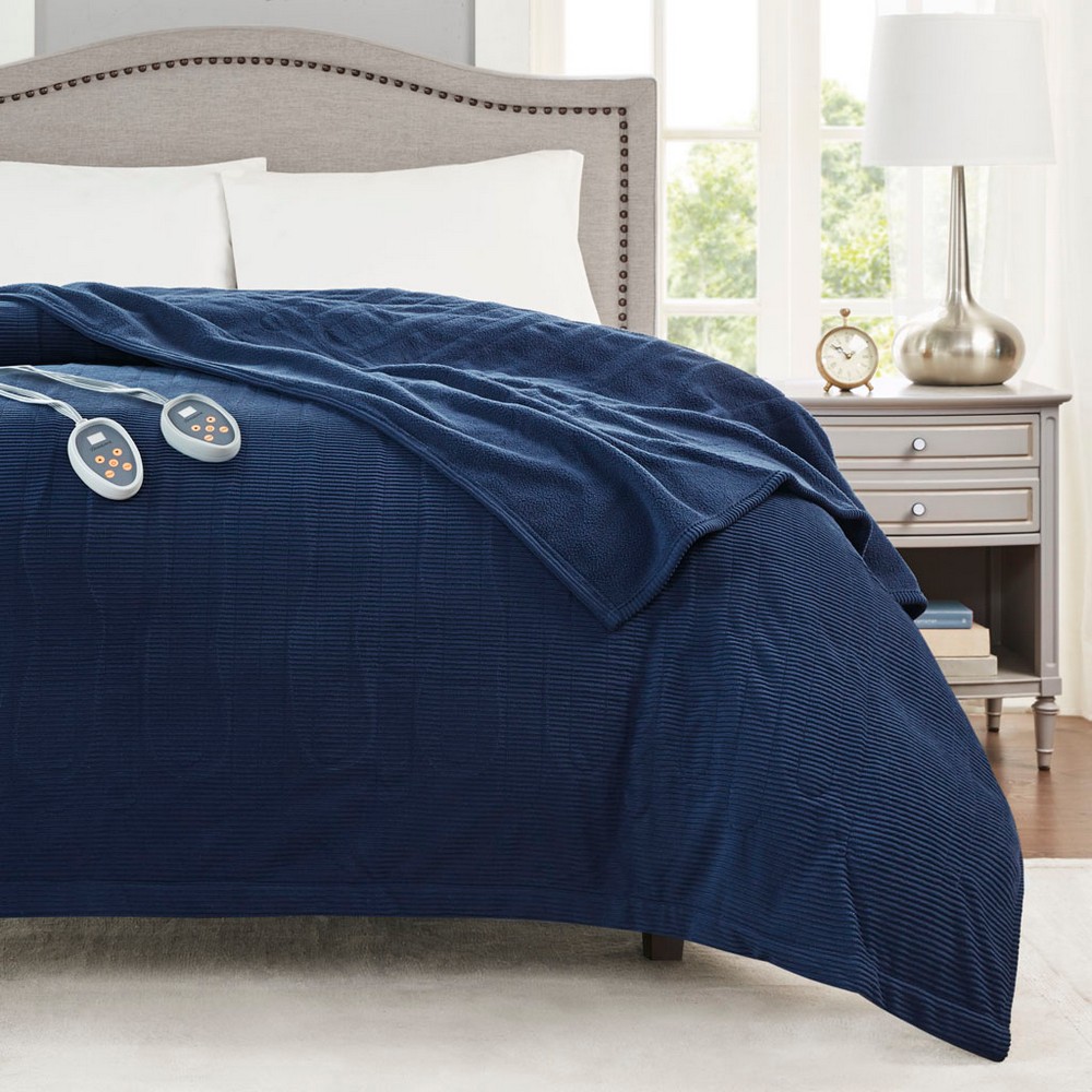 | Beautyrest Full 1 Heated Blanket: 80"W x 84"L 100% polyester textured micro fleece face, 100% polyester solid micro fleece reverse Casual Style Includes 1 Piece(s) Machine wash cold, gentle cycle, and separately. Do not bleach. tumble dry low, remove promptly. do not iron. If there is no free movement in the washer or dryer, use large capacity commercial washer/dryer Nestle into our Beautyrest Electric Micro Fleece Heated Blanket with Secure Comfort Technology. Designed to virtually eliminate Electro Magnetic Field emissions, this electric blanket features a 10-hour auto shut-off timer and a 20 setting temperature control to ensure your safety. Soft flexible wires and ultra-soft micro fleece fabric provides exceptional comfort and warmth. Machine washable for easy care, this heated blanket is OEKO-TEX certified, meaning it does not contain any harmful substances or chemicals to ensure quality comfort and wellness. Twin and Full sizes have one controller, while Queen and King sizes have two controllers. Includes manufacturer’s 5-year warranty. |
