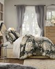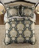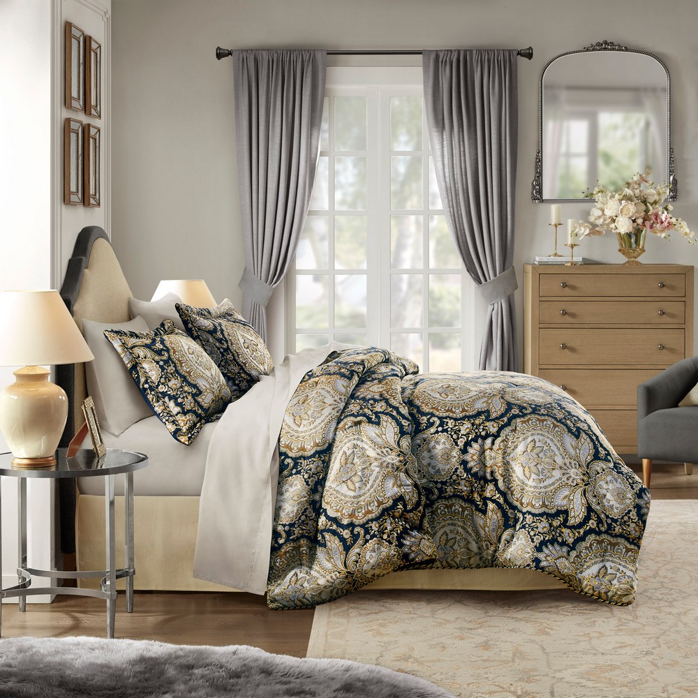Inspired by the 16th century traditional textile, a time in which medallions were widely used in decorations. The navy base color is softened by the blend of ivory, gold and taupe hues, layered with accents of lilac and sage. The comforter pattern is decorated with delicate florals and reverses to a solid fabric on the back. The soft chenille yarns blend and weave for added dimension and luxurious feel.