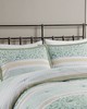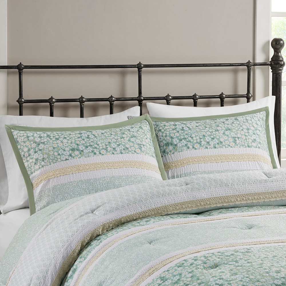 | Madison Park Full/Queen 1 Comforter: 90"W x 90"L 2 Standard Shams: 20"W x 26"L (2) 1 Throw Pillow: 12"W x 18"L 1 Throw Pillow: 18"W x 18"L Comforter/Sham: Seersucker microfiber with lace, printed, solid microfiber, 100% polyester reverse Fill: 100% polyester Pillow: 100% polyester Shabby Chic Style Includes 5 Piece(s) Machine washable, spot clean pillows Featuring three different floral and botanical print designs separated by lace trims, this seersucker microfiber comforter set exudes shabby chic/farmhouse style that adds a touch of elegance to any bedroom. The two decorative pillows feature gathered fabric and embroidery with lace trim and ruffles, adding to the overall charm of the set. Colors featured in this set include various shade of greens, yellows, and whites. The comforter and pillows are filled with hypoallergenic polyester filling that is treated to be dustproof, ensuring a restful and comfortable sleeping experience. This machine washable bedding set features an antimicrobial treatment, which inhibits bacteria growth and keeps the bedding fresher for longer. |