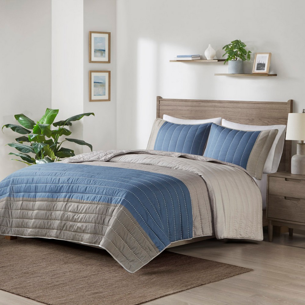 Bring a cozy casual vibe to your bedroom with the Madison Park Blake quilted quilt set. A color block design in soft neutral and blue colors are printed on the face of the quilt and complemented by a solid taupe reverse, for a farmhouse look. The channel quilting adds texture and the polyester filling provides plenty of warmth, making it great for single use in the summer or as an extra layer in the winter.