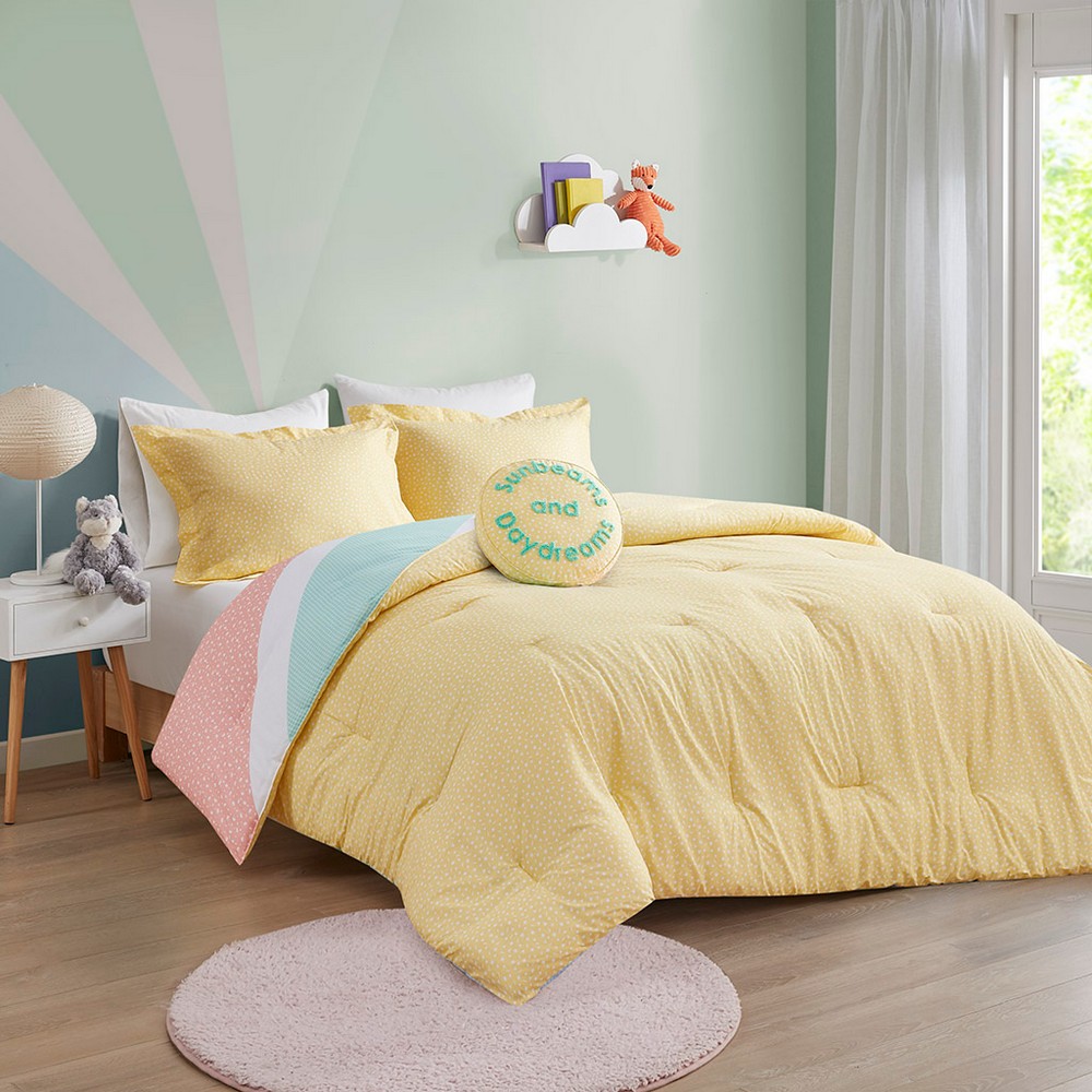 | Urban Habitat Kids Twin 1 Comforter: 68"W x 88"L 1 Standard Sham: 20"W x 26"L 1 Decorative Pillow: 14"W x 14"L + 1.5"D Comforter/Sham: 100% cotton printed face and reverse, 5.9oz/sq yard poly fill. Pillow: Cotton cover and poly fill Modern/Contemporary Style Includes 3 Piece(s) Machine Wash. Spot Clean Pillows Add a burst of color to your kid’s room with the Urban Habitat Kids Rory Rainbow Sunburst Reversible Cotton Comforter Set. This cotton comforter features a colorful sunburst pattern with a confetti print on the reverse, for a fun and cheerful look. The 2 shams (1 in Twin) coordinate with the bright colors of the reversible comforter to spread sunshine throughout your child’s bed. A round decorative pillow adds an adorable finishing touch. An antimicrobial treatment provides built-in freshness protection, reducing the growth of odor causing bacteria to keep fabric lasting longer. This kid’s rainbow bedding set is also OEKO-TEX certified, meaning it does not contain any harmful substances or chemicals to ensure quality comfort. Items in the set may come in a rolled or compressed packaging, which will need to be fluffed up or steam ironed before use to remove wrinkles. |