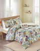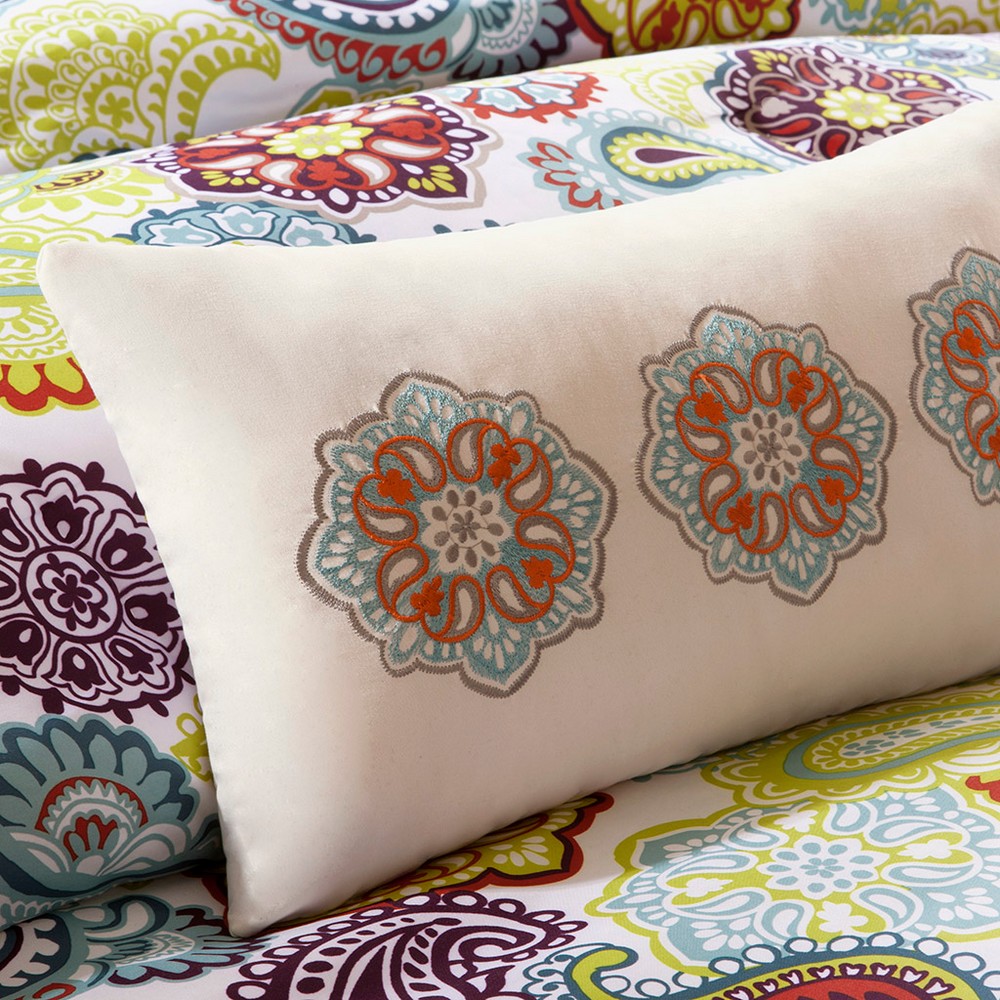 | Mi Zone King/Cal King 1 Comforter: 102x90" 2 King Shams: 20x36+2" (2) 1 Pillow: 10x18" Comforter/Sham: 85gsm polyester microfiber, printed, solid microfiber reverse, 200 gram polyester filling Pillow: polyester cover and polyester filling Global Inspired Style Includes 4 Piece(s) MACHINE WASH COLD, GENTLE CYCLE, AND SEPARATELY. DO NOT BLEACH. TUMBLE DRY LOW, REMOVE PROMPTLY. DO NOT IRON. IF THERE IS NO FREE MOVEMENT IN THE WASHER OR DRYER, USE LARGE CAPACITY COMMERCIAL WASHER/DRYER. Bold and bright, the Mi Zone Tamil Comforter Set can revitalize the look of your bedroom. An updated paisley pattern is vibrantly showcased with an eclectic mix of floral prints and medallions, while matching sham(s) harmonize with the colorful pattern seen on top of the bed. Made from ultra-soft microfiber, this bedding set is exceptionally soft to the touch and machine washable for easy care. A decorative pillow that features embroidered details fashionably completes this fun comforter set. This bedding set uses an antimicrobial treatment that provides built-in freshness protection, reducing the growth of odor causing bacteria to keep fabric lasting longer. |