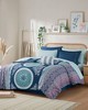 | Intelligent Design Queen 1 Comforter: 90"W x 90"L 2 Standard Shams: 20"W x 26"L + 2"D (2) 1 Bedskirt: 60"W x80"L + 14"D 1 Decorative Pillow: 12"W x 16"L 1 Flat Sheet: 90"W x 102"L 1 Fitted Sheet: 60"W x 80"L + 12"D 2 Standard Pillowcase: 20"W x 30"L(2) Comforter / Sham: Face: 100% polyester brushed microfiber, printed; Back: 100% polyester brushed solid microfiber; Filling: 100% polyester 170gsm; Flat sheet / Fitted sheet: 100% polyester brushed microfiber, printed; Dec. Pillow: polyester cover and polyester filling Global Inspired Style Includes 9 Piece(s) Machine Wash The Intelligent Design Loretta Boho Comforter Set with Bed Sheets brings a bright, casual update to your bedroom. A large medallion print, in navy and purple, runs down the center of the comforter with subtle bohemian details highlighted in white. Coordinating shams (1 in Twin/TwinXL) with embroidered borders complement the comforter. A decorative pillow with ruched and pieced detailing and a solid navy bed skirt finishes the look. Also included is a complete sheet set that reiterates the bohemian motif. This bedding set is also OEKO-TEX certified, meaning it does not contain any harmful substances or chemicals to ensure quality comfort and wellness. |
