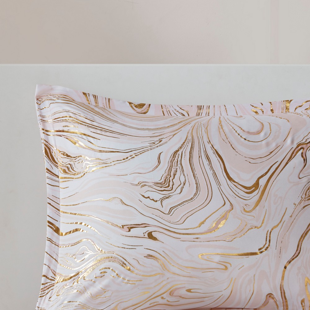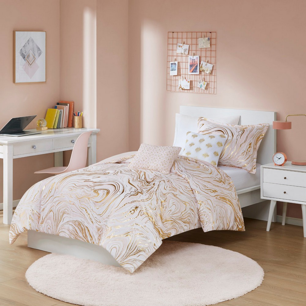 | Intelligent Design Twin/Twin XL 1 Comforter: 68"W x 90"L 1 Standard Sham: 20"W x 26"L + 1"D 1 Decorative Pillow: 12"W x 16"L 1 Decorative Pillow: 16"W x 16"L Comforter/sham:100% polyester brushed metallic printed microfiber on face, solid microfiber reverse; sham with overlap opening at back; comforter has 100% poly fill. Pillow: 100% polyester brushed microfiber cover, poly fill Modern/Contemporary Style Includes 4 Piece(s) Machine wash cold separately, gentle cycle. Do not bleach. Tumble dry low. Do not iron. If there is no free movement in washer/dryer, use large capacity commercial washer/dryer. Spot clean pillows. Make your bedroom shine with the Intelligent Design Rebecca Metallic Printed Comforter Set. This extra-soft, brushed microfiber comforter flaunts a swirl marble print in blush, white, and gold metallic hues, for a stunning contemporary design. A solid blush reverse complements the top of the bed, while matching shams (1 in Twin/TwinXL) mirror the look of the comforter. Two decorative pillows with shiny gold thread add the perfect finishing touches to the modern comforter set. This bedding set is OEKO-TEX certified, meaning it does not contain any harmful substances or chemicals, and uses an antimicrobial treatment that provides built-in freshness protection, reducing the growth of odor causing bacteria to keep fabric lasting longer. |