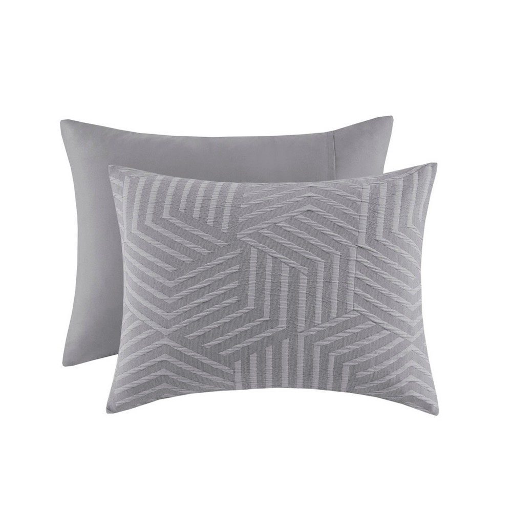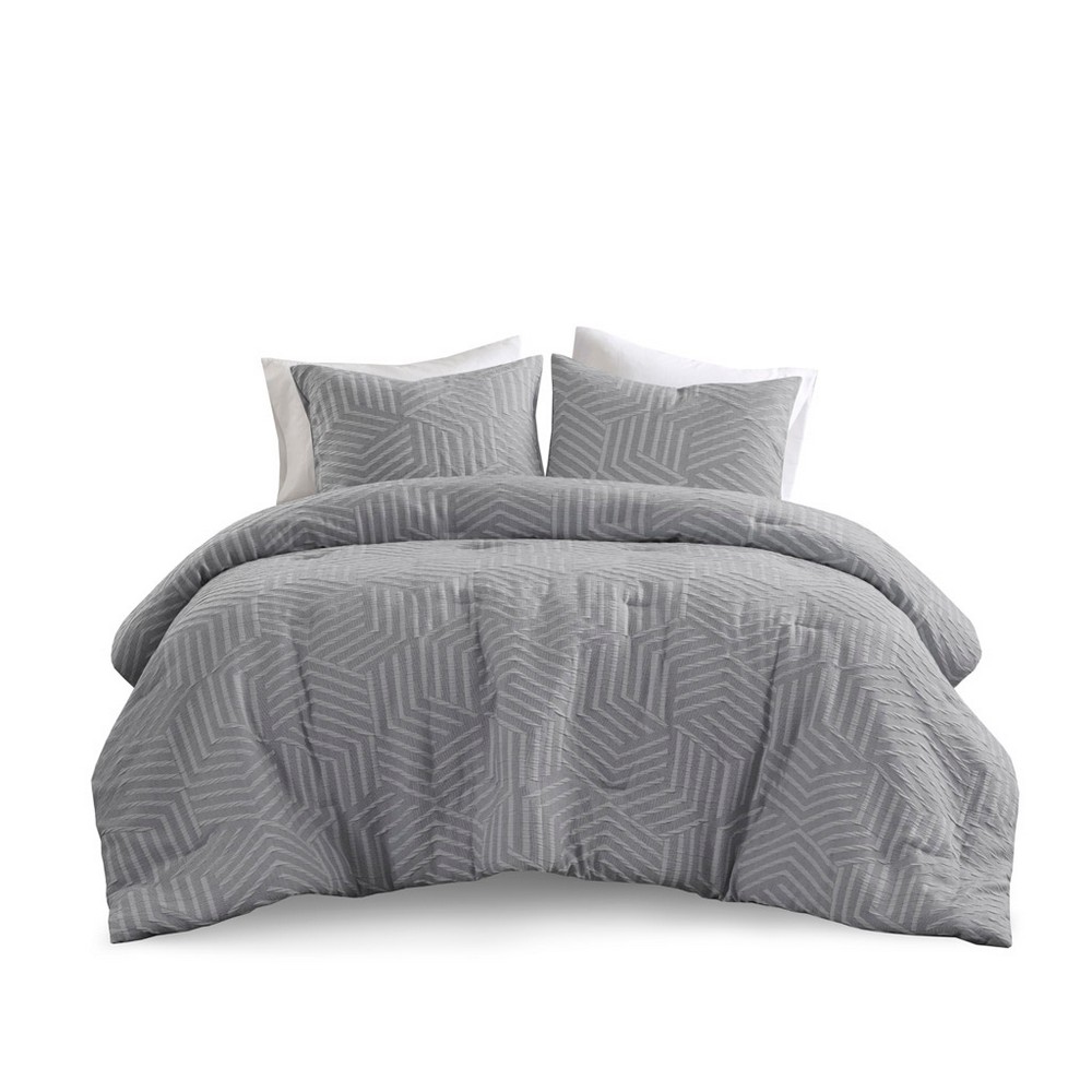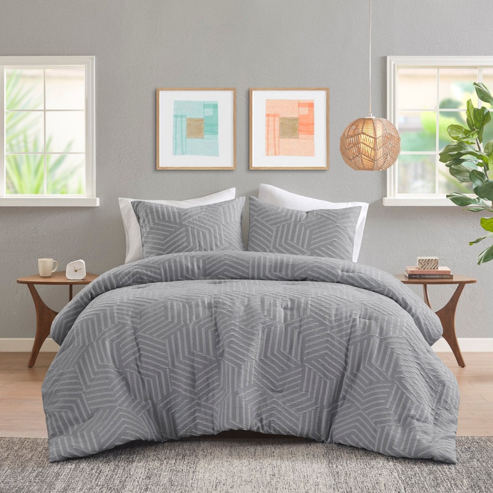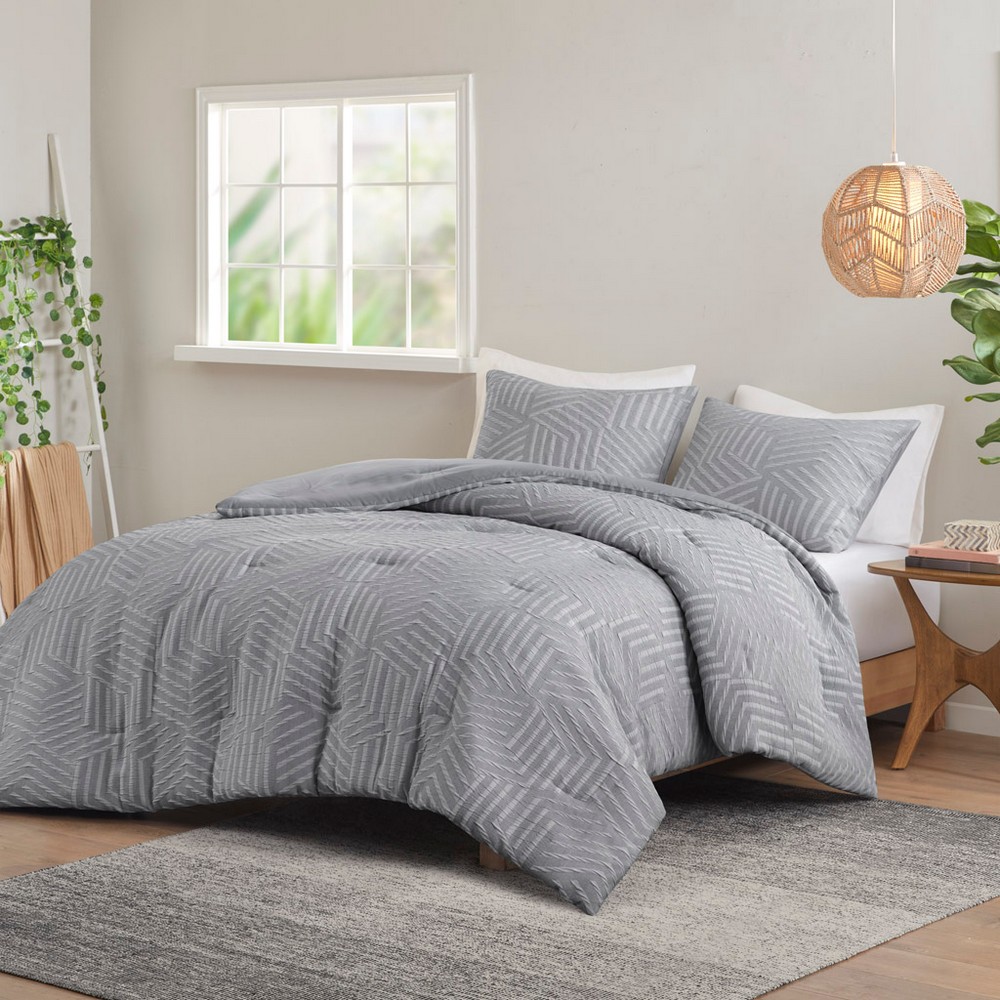 | Urban Habitat King/Cal King 1 Comforter: 104"W x 92"L 2 King Shams: 20"W x 36"L (2) Comforter/Sham: 100% polyester jacquard face; microfiber back Fill: 100% polyester Modern/Contemporary Style Includes 3 Piece(s) Machine wash cold separately, gentle cycle. Do not bleach. Tumble dry low. Do not iron. If there is no free movement in washer/dryer, use large capacity commercial washer/dryer. Featuring a tonal geometric design, the Urban Habitat Bentley matelasse jacquard comforter set adds a modern and sophisticated style to your bedroom. The grey blue comforter has a soft microfiber reverse, while coordinating shams complete the look of the bedding set. The comforter is filled with hypoallergenic polyester filling that is treated to be dustproof, ensuring a restful and comfortable sleeping experience. Plus, this comforter set has an antimicrobial treatment to keep the bedding fresher for longer by inhibiting bacteria growth and is machine washable for easy care. |