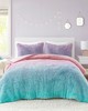 | Mi Zone Full/Queen 1 Comforter: 86"W x 90"L 2 Standard Shams: 20"W x 26"L (2) Comforter/Sham: 100% polyester faux shaggy fur. Reverse: 100% polyester microfiber. Antimicrobial finish. Comforter Fill: 100% polyester filling Shams with overlap opening at back. Modern/Contemporary Style Includes 3 Piece(s) Machine wash cold separately, gentle cycle. Do not bleach. Tumble dry low. Steam Iron Only. If there is no free movement in washer/dryer, use large capacity commercial washer/dryer. Add a cozy and stylish update to your bedroom with the Mi Zone Primrose ombre shaggy faux fur comforter set. The ultra soft comforter features a pink, purple, and aqua ombre shaggy faux fur that creates a fun and trendy look, while 2 coordinating shams (1 in Twin/TwinXL) complete the bedding set. Hypoallergenic polyester filling in the comforter contains no allergens and is treated to be dustproof, and provides exceptional warmth for a restful night's sleep. Machine washable for easy care, this bedding set is also OEKO-TEX certified, meaning it does not contain any harmful substances or chemicals, and has an antimicrobial treatment that provides built-in freshness protection, reducing the growth of odor causing bacteria to keep fabric lasting longer. Sham varieties include pink, purple, and aqua colors; only 1 color variety in each bedding set. Bedding may come in rolled or compressed packing and will need to be fluffed up. Use a steam iron to help remove wrinkles easier. |