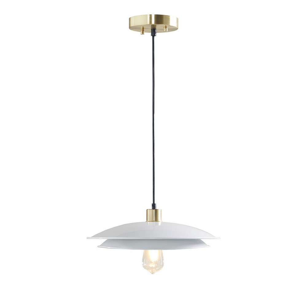 The Saben 2-Tier Layered Shade Pendant by INK+IVY provides a simple and classic addition to your dining room or kitchen decor. This single bulb hanging pendant features a double layered disc shade, in a matte white finish, to create a mid-century modern design. The gold ceiling base complements the shade, for a striking look. Elevate and brighten your space with the unique and eye-catching style of this pendant light. 1 Type A bulb is needed (not included).