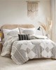 | Madison Park King/Cal King 1 Comforter: 104"W x 92"L 2 King Shams: 20"W x 36"L (2) 1 Throw Pillow: 12"W x 18"L Comforter/Sham: 100% polyester printed soft microfiber, chenille trim face, solid microfiber reverse Fill: 100% polyester Pillow: Microfiber cover with polyester fill Artisan Style Includes 4 Piece(s) Machine washable, spot clean pillows This soft microfiber artisan comforter set displays a printed global inspired design, perfect for chic boho bedroom. Featuring small triangular shapes and lines that when formed together depicts larger geometric shapes and stripes on top of a beige and ivory background. Two white chenille trim at the center of the bed adds dimension to the set while the dark throw pillow adds contrasts. Colors featured in this set include various shade black, brown, tan, and grey. The comforter and pillows are filled with hypoallergenic polyester filling that is treated to be dustproof, ensuring a restful and comfortable sleeping experience. This bedding set is also OEKO-TEX certified and machine washable for easy care. |