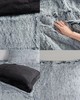 Comforter: Solid 100% polyester back printed shaggy long fur to 100% polyester plush reverse, polyester fiber filling, end-to-end box quilting with knife edge Sham: Solid 100% polyester shaggy long fur to 100% polyester plush, 3" overlap on back open