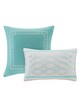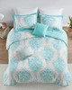 | Intelligent Design King/Cal King 1 Comforter: 104"W x 90"L 2 King Shams: 20"W x 36"L + 2"D (2) 1 Decorative Pillow: 12"W x 18"L 1 Decorative Pillow: 16"W x 16"L Comforter/Sham: 100% polyester microfiber, printed, brushed microfiber reverse, 200 gram polyester filling Pillow: polyester cover and polyester filling Transitional Style Includes 5 Piece(s) MACHINE WASH COLD, GENTLE CYCLE, AND SEPARATELY. DO NOT BLEACH. TUMBLE DRY LOW, REMOVE PROMPTLY, DO NOT IRON. IF THERE IS NO FREE MOVEMENT IN THE WASHER OR DRYER, USE LARGE CAPACITY COMMERCIAL WASHER/DRYER. Make a statement in your bedroom with Intelligent Design’s Senna Comforter Set. Flaunting a large damask print, this beautiful comforter creates a soft contrast with a gorgeous aqua and grey color palette. The matching shams (1 for Twin/TwinXL sizes) echoes the elegant pattern seen on top of the bed, while a solid flange provides a finishing touch. Machine washable for easy care, this chic comforter set is made from ultra-soft microfiber for long-lasting comfort and style. Coordinating decorative pillows feature intricately embroidered details to complete this captivating look. This bedding set uses an antimicrobial treatment that provides built-in freshness protection, reducing the growth of odor causing bacteria to keep fabric lasting longer. |