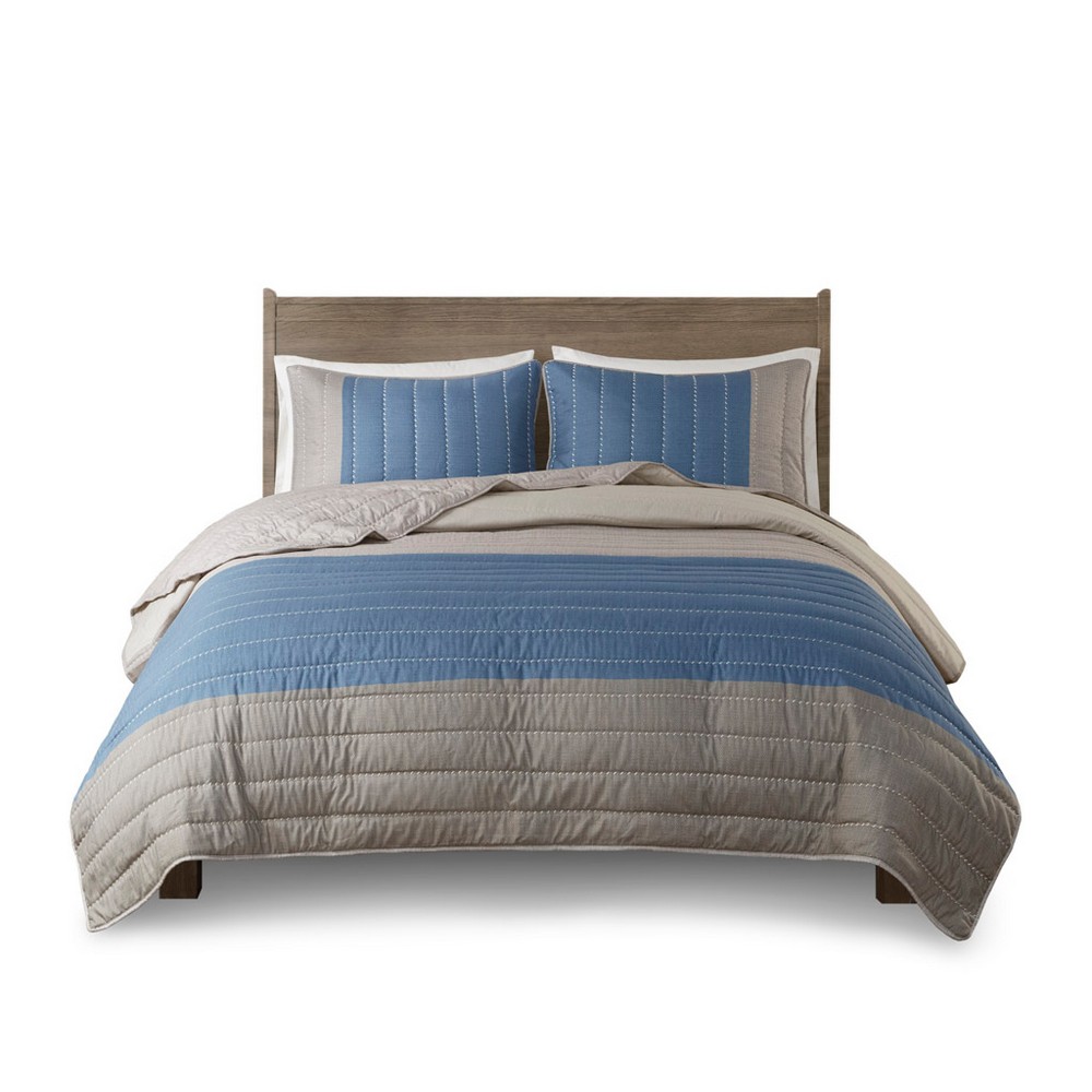 Blake 3 Piece Printed Color Blocking Microfiber Quilt Set Taupe Blue King