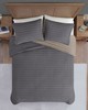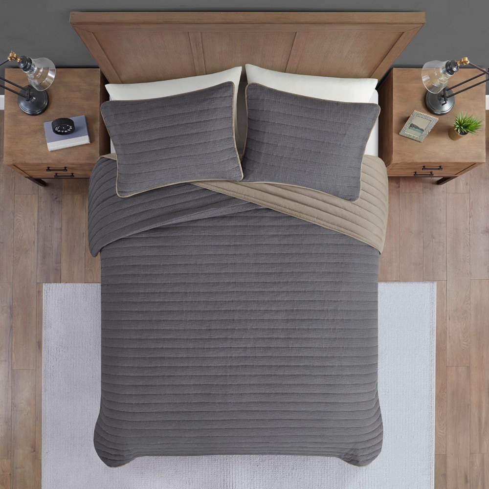 | Madison Park King/Cal King 1 Quilt: 104"W x 94"L 2 King Shams: 20"W x 36"L(2) Quilt/Sham: 100% polyester face, 100% polyester microfiber reverse Filling: 100% polyester Casual Style Includes 3 Piece(s) Machine Washable Introduce a casual comfort and easily coordinating style to your bedroom with this reversible quilt set. A crinkled fabric design, in a gray color, creates texture and dimension to give this farmhouse quilt set a casual look and relaxing vibe. The solid taupe reverse features channel stitching to complement the quilt’s color and style, making it easy to pair either side with your bedroom decor. With 2 matching shams included, this reversible quilt set is perfect by itself or as a layering piece for added style and warmth on those colder nights. |