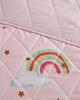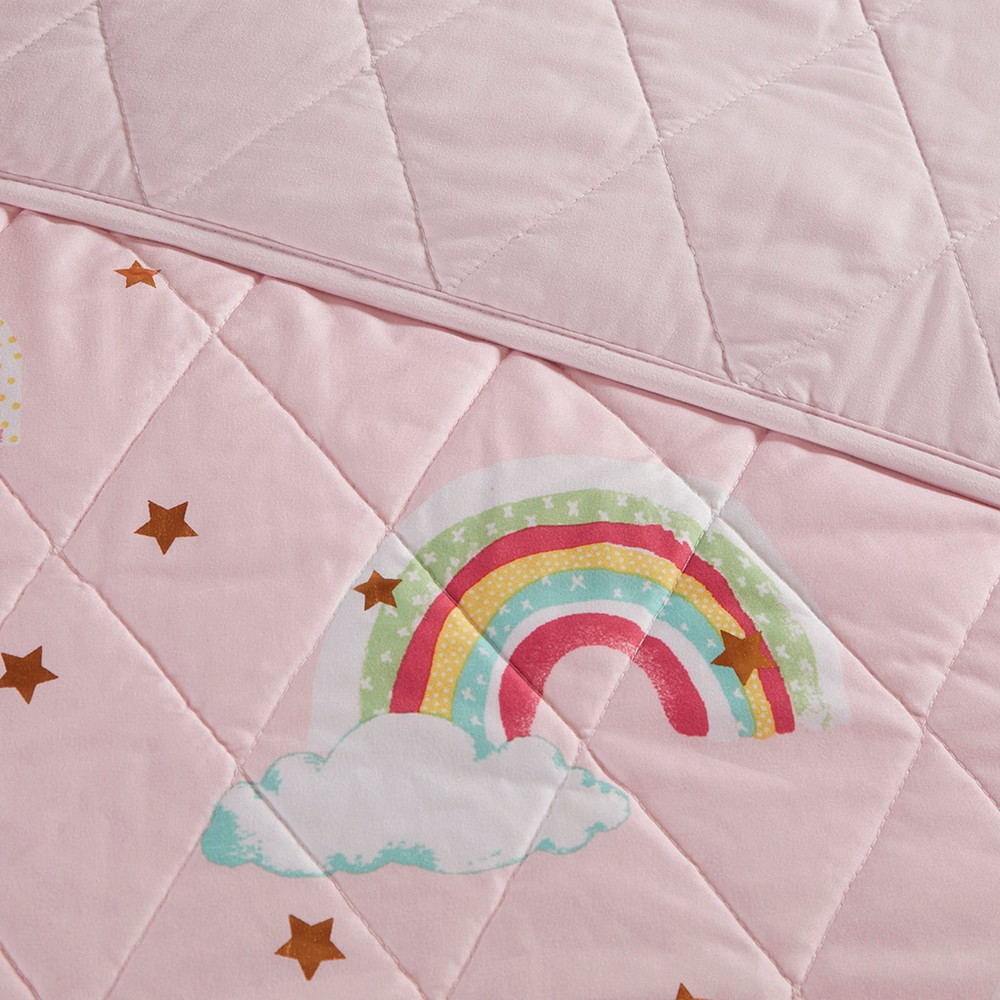 | Mi Zone Kids Full/Queen 1 Quilt: 86"W x 86"L 2 Standard Shams: 20"W x26"L + 0.5"D (2) 1 Decorative Pillow: 12"W x 16"L + 0.25"D Quilt/Sham: 100% polyester brushed fabric, printed with gold metallic, brushed solid reverse, all over quilted with 100% cotton filling; sham with 0.5" piping and overlap opening at back, pre-washed finishing. Pillow: 100% polyester brushed fabric shell, 100% polyester fill Casual Style Includes 4 Piece(s) Machine wash cold separately, gentle cycle. Do not bleach. Tumble dry low. Do not iron. If there is no free movement in washer/dryer, use large capacity commercial washer/dryer. Spot clean pillows. Bring a whimsical charm to your girl’s bedroom with the Mi Zone Kids Alicia Rainbow with Metallic Printed Stars Reversible Quilt Set. An adorable rainbow and gold metallic star print adorns the pink quilt and 2 shams (1 in Twin/TwinXL) for a cute and playful look. The solid pink reverse complements the entire ensemble and adds a soft pop of color. The oblong decorative pillow features an embroidered unicorn and provides a fun finishing touch to this kid’s quilt. Ideal for use in the summer, this kid’s quilt offers an extra layer of warmth in the winter. Cotton-rich filling in the quilted quilt and hypoallergenic polyester filling in the decorative pillow provide extra softness and comfort. Pre-washed for extra softness, this kid’s quilt set brightens up your child’s bedroom with its delightful allure and is machine washable for easy care. This bedding set uses an antimicrobial treatment that provides built-in freshness protection, reducing the growth of odor causing bacteria to keep fabric lasting longer. Items in the set may come in a rolled or compressed packaging, which will need to be fluffed up or steam ironed before use to remove wrinkles. |