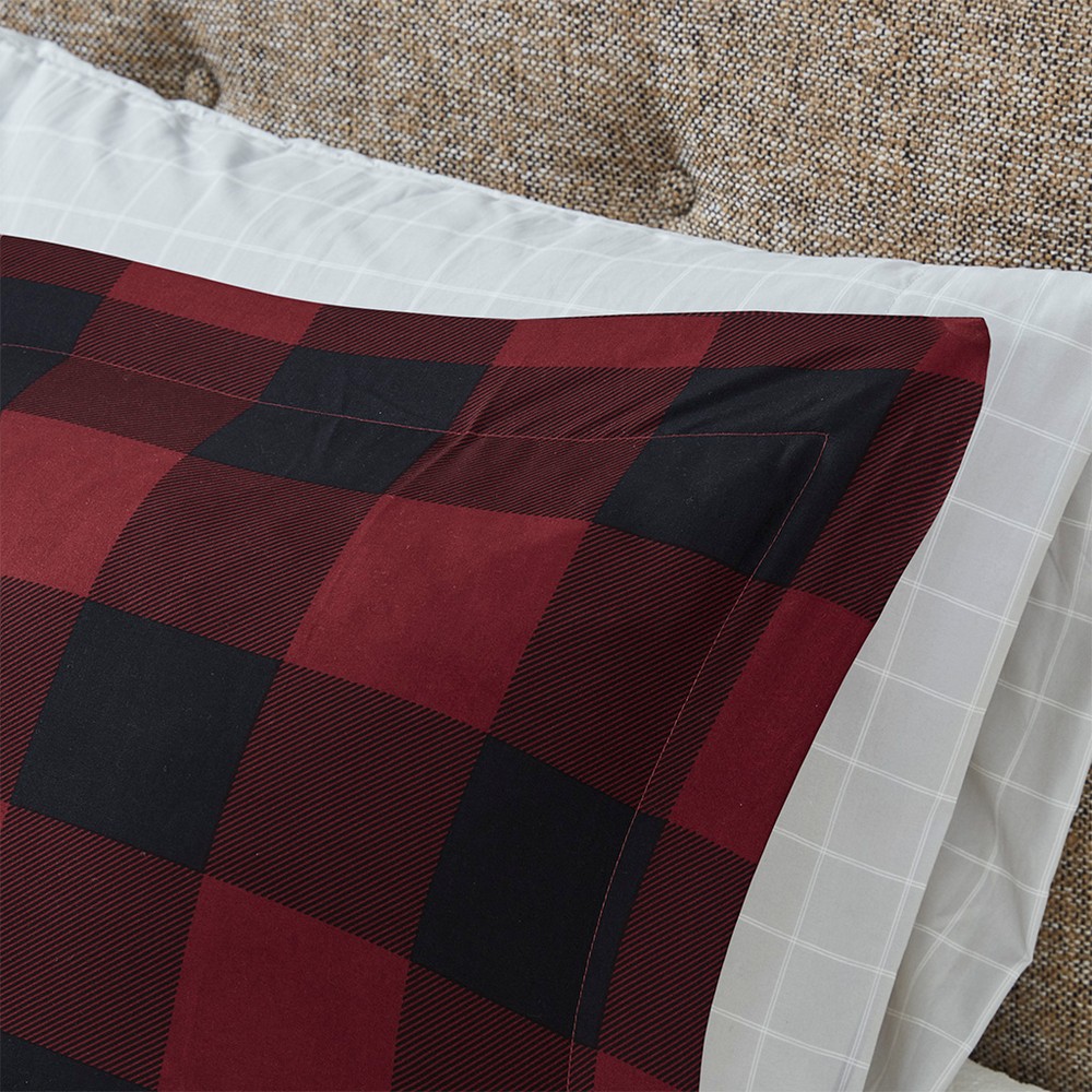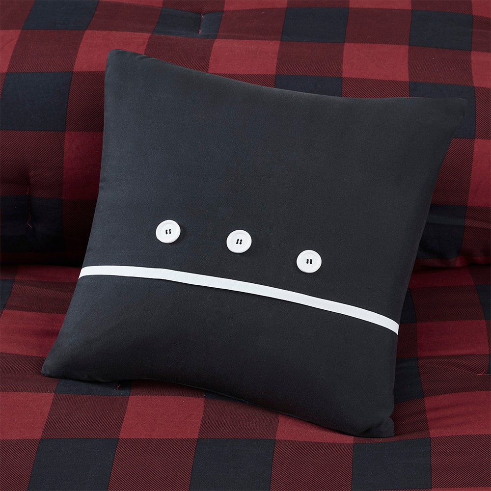 | Madison Park Essentials Full 1 Comforter: 78"W x 86"L 2 Standard Shams: 20"W x 26"L + 2"D (2) 1 Flat Sheet: 81"W x 96"L 1 Fitted Sheet: 54"W x 75"L + 14"D 2 Standard Pillowcases: 20"W x 30"L (2) 1 Decorative Pillow: 16"W x 16"L Soft brushed microfiber print comforter and shams, 6oz/sqyd poly fill; 100% polyester micro fiber sheets Lodge/Cabin Style Includes 8 Piece(s) Machine Washable, Spot Clean Pillow The Madison Park Essentials Everest Reversible Comforter Set with Bed Sheets brings a cozy cabin allure to your bedroom decor. A red and black buffalo check print adorns the front of the ultra-soft microfiber comforter, for a rustic lodge look. On the reverse, a smaller checker pattern in a coordinating color scheme complements the top of the bed, while matching shams (1 for Twin/Twin XL Sizes) complete the reversible comforter set. A square decorative pillow with embroidery and button details add the finishing touches. This complete bedding set is OEKO-TEX certified, meaning it has no harmful substances or chemicals ensuring quality comfort and wellness. Bringing the best in health and wellness, this bedding set also features an anti-microbial treatment that provides built-in freshness protection, reducing the growth of odor causing bacteria and keeps fabric lasting longer. Also included is a printed grey sheet set with 1 flat sheet, 1 fitted sheet, and pillowcases (1 for Twin/Twin XL Sizes). The fitted sheet fits mattresses with up to a 14-inch depth (12-inch for Twin). Machine washable for easy care, this reversible complete bedding set transforms your bedroom into a cozy cabin retreat. This bedding set may come in rolled or compressed packing and will need to be fluffed up. Use a steam iron to help remove wrinkles easier. |