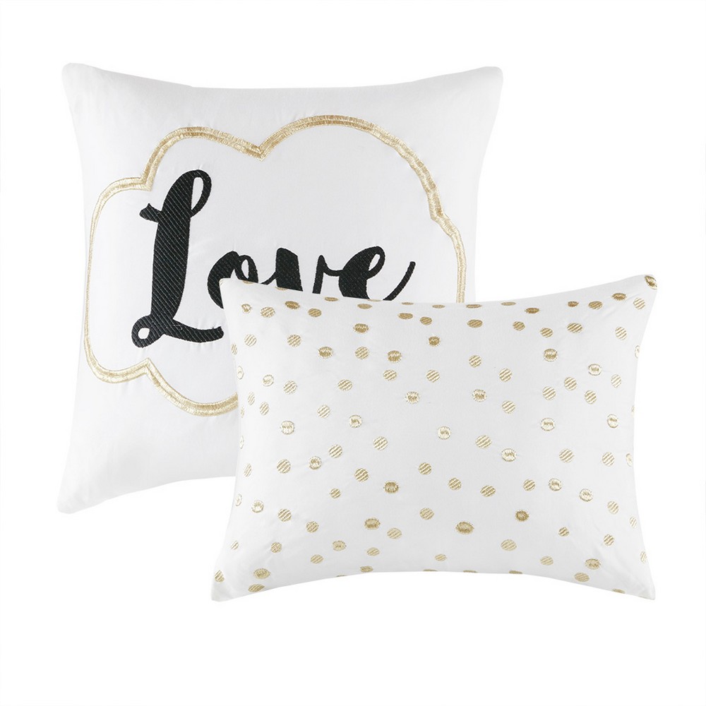 | Intelligent Design King/Cal King 1 Comforter: 104"W x 90"L 2 King Shams: 20"W x 36"L + 1"D (2) 1 Decorative Pillow: 12"W x 16"L 1 Decorative Pillow: 16"W x 16"L Comforter / Sham: Face: 100% polyester brushed microfiber, with metallic printing. Back: 100% polyester brushed microfiber, solid. Filling: 100% polyester 5.9oz/sq yard. Pillow: polyester cover and polyester filling Modern/Contemporary Style Includes 5 Piece(s) Machine wash cold separately, gentle cycle. Do not bleach. Tumble dry low. Do not iron. If there is no free movement in washer/dryer, use large capacity commercial washer/dryer. Spot clean pillows. Freshen up your bedroom with the enchanting style of Intelligent Design’s Raina Comforter Set. The stunning comforter flaunts a geometric, metallic gold print against a soft ivory ground for a fun and eye-catching look! Matching sham(s) echo the design seen on top of the bed to pull the entire ensemble together. Two embroidered decorative pillows with typography and metallic details complete this fabulous, ultra-soft microfiber comforter set. Set includes comforter, 2 shams (1 sham in Twin/TwinXL), 1 oblong and 1 square decorative pillows. This bedding set uses an antimicrobial treatment that provides built-in freshness protection, reducing the growth of odor causing bacteria to keep fabric lasting longer. Items in the set may come in a rolled or compressed packaging, which will need to be fluffed up or steam ironed before use to remove wrinkles. |
