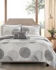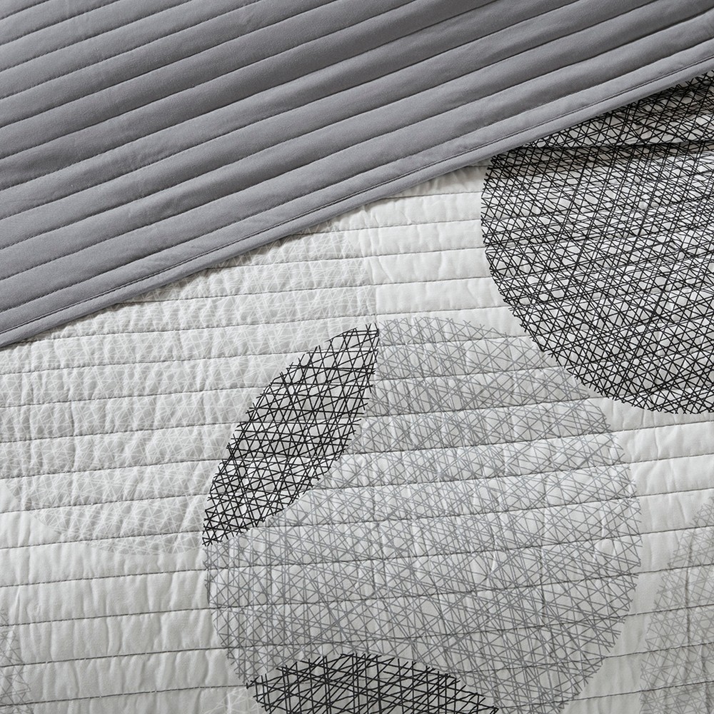 | Madison Park Essentials Twin 1 Quilt: 68"W x 86"L 1 Standard Sham: 20"W x 26"L 1 Flat Sheet: 66"W x 96"L 1 Fitted Sheet: 39"W x 75"L + 12"D 1 Pillowcase: 20"W x 30"L 1 Decorative Pillow: 12"W x 18"L Quilt/Sham: Microfiber, printed, solid reverse, 90% cotton, 10% other fiber filling Sheets: Cotton, printed Pillow: polyester cover and polyester filling Casual Style Includes 6 Piece(s) Machine wash cold, gentle cycle, and separately. Do not bleach. Tumble dry low, remove promptly. Do not iron. If there is no free movement in the washer or dryer, use large capacity commercial washer/dryer. The Madison Park Essentials Knowles Complete Reversible Quilt and Cotton Sheet Set brings a clean, modern update to your bedroom. A geometric print of dark, white, and light grey circles covers this soft microfiber quilt, for a refreshing allure. Matching shams (1 for Twin Sizes) repeat the design on the quilt, while an embroidered decorative pillow provide the finishing touches. Also included is a complete cotton sheet set with a coordinating geometric print. Bringing the best in health and wellness, this bedding set also features an anti-microbial treatment that provides built-in freshness protection, reducing the growth of odor causing bacteria and keeps fabric lasting longer. This bedding set is also OEKO-TEX certified, meaning it does not contain any harmful substances or chemicals, ensuring quality comfort and wellness. |