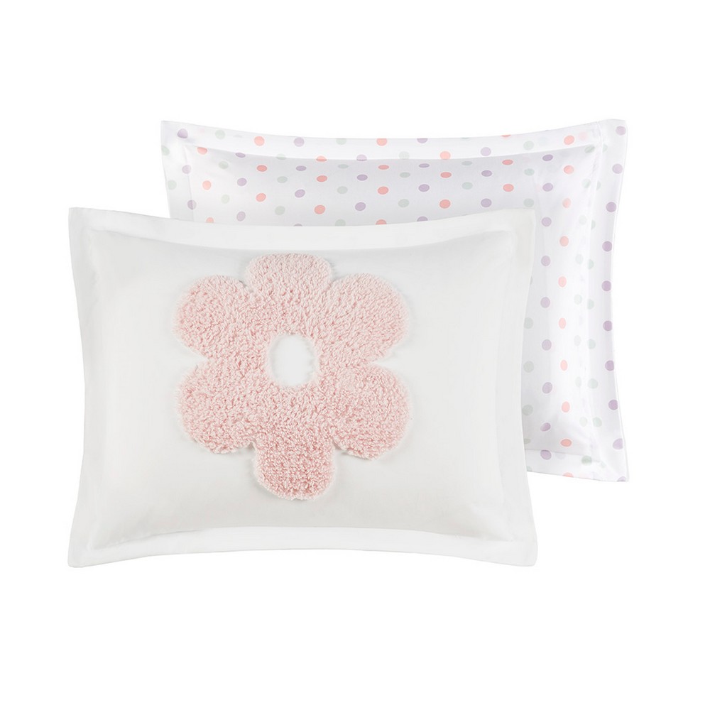 | Urban Habitat Kids Full/Queen 1 Comforter: 88"W x 88"L 2 Standard Shams: 20"W x 26"L (2) 1 Throw Pillow: Dia.14" Comforter/Sham: Polyester with tufted chenille face, microfiber back. Fabric with antimicrobial treatment. Filling: 100% polyester Decor Pillow: Polyester plush cover with polyester fill Casual Style Includes 4 Piece(s) Machine wash cold separately, gentle cycle. Do not bleach. Tumble dry low. Do not iron. If there is no free movement in washer/dryer, use large capacity commercial washer/dryer. Spot clean pillow. The Urban Habitat Kids Gracie comforter set features a charming floral tufted chenille design in purple, pink, and aqua on one side and a coordinating polka dot reverse on the other, giving your child two fun options to style their bed. This comforter adds a touch of charm and whimsy to their room with its colorful, soft chenille texture and cute flower shaped decorative pillow. Also included are coordinating shams (1 in Twin) to complete this kids bedding set. The hypoallergenic polyester comforter filling contains no allergens and is treated to be dustproof so your child can sleep comfortably. This machine washable kids comforter set is also OEKO-TEX certified, featuring antimicrobial treatment which keeps the fabric fresh and long lasting. |