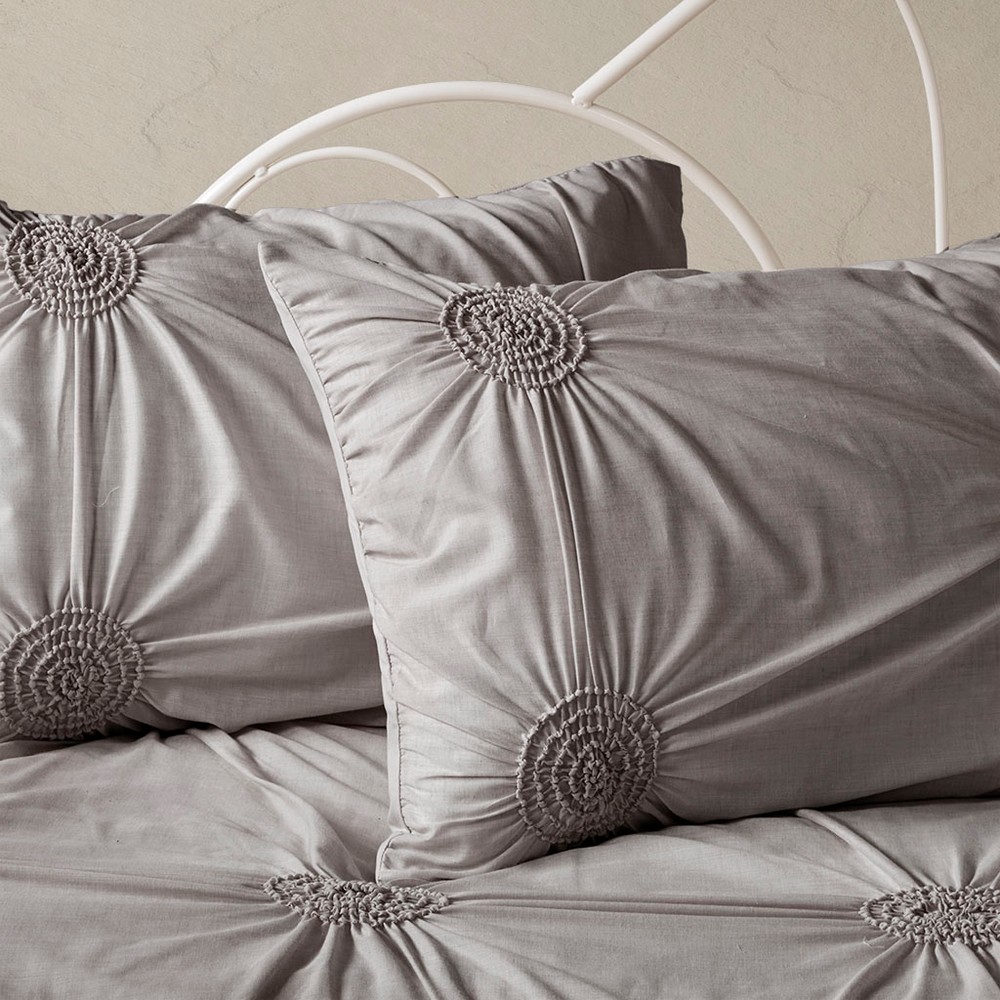 | Madison Park Daybed 1 Daybed Cover: 39"W x 75"L + 17"D 3 Standard Shams: 20"W x 26"L (3) 1 Bedskirt: 39"W x 75"L + 15"D 1 Decorative Pillow: 18"W x 18"L 80%polyester,20%cotton daybed ,elastic embroidery, 3.5oz/yd2 polyester filling ;microfiberbedskirt ,80%polyester,20%cotton pillow Shabby Chic Style Includes 6 Piece(s) Machine Washable Spot Clean Pillow Grace your bedroom with the beauty and comfort of the Madison Park Leila 6 Piece Reversible Daybed Cover Set. The gorgeous dark grey daybed cover flaunts tufting and ruche detailing in a puckered diamond design with quilted on reverse, for a charming textural look. The 3 matching shams mirror the top of the daybed coordinating beautifully with the rest of the ensemble. An embroidered decorative pillow adds a stunning accent, while a solid bed skirt provides a clean finish to complete the bedding set. Displaying a yarn dye look, this tufted daybed cover set fits a Twin size mattress and brings s graceful elegance to your guest bedroom decor. |