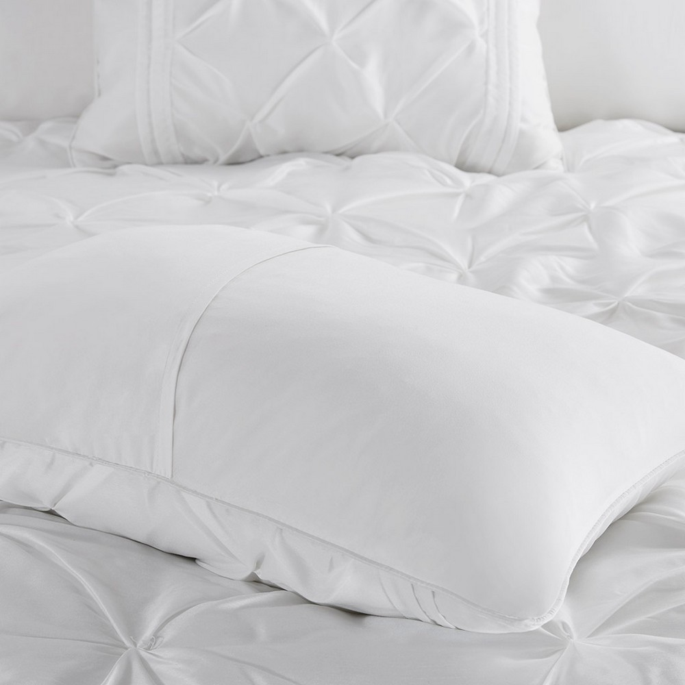 | Madison Park Full 1 Comforter: 82"W x 90"L 2 Standard Shams: 20"W x 26"L (2) 1 Bed Skirt: 54"W x 75"L + 15"D 1 Decorative Pillow: 12"W x 18"L 1 Decorative Pillow: 18"W x 18"L 1 Decorative Pillow: D6.5" x 18"L Comforter/Sham: 100% polyester polyoni, pieced, pleated, 100% brushed polyester reverse, 270g/m2 polyester filling Bedskirt: 100% polyester fabric drop, polyester platform Pillows: 100% polyester polyoni cover, polyester filling Transitional Style Includes 7 Piece(s) MACHINE WASH COLD, GENTLE CYCLE, AND SEPARATELY. DO NOT BLEACH. TUMBLE DRY LOW, REMOVE PROMPTLY, DO NOT IRON. IF THERE IS NO FREE MOVEMENT IN THE WASHER OR DRYER, USE LARGE CAPACITY COMMERCIAL WASHER/DRYER. This beautifully tufted bed is from the Laurel bedding collection. Its white coloring makes this set easy to accessorize in your bedroom. The collection is made from 100% polyester polyoni and has pieced fabric sewn together to give this set added dimension. It is finished with a smooth edge of fabric that creates a beautiful border around this comforter. Items in the set may come in a rolled or compressed packaging, which will need to be fluffed up or steam ironed before use to remove wrinkles. |