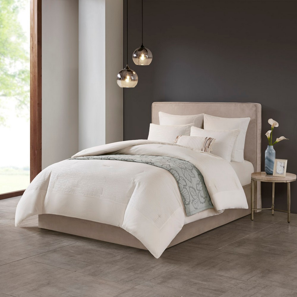| N Natori Full/Queen 1 Comforter: 92"W x 96"L 2 Standard Shams: 20"W x 26"L (2) Comforter and sham Face: Poly/Cotton yarn dyed fabric pieced with cotton percale binding; Reverse: percale solid. Comforter filling: 100% polyester 300gsm. Hidden bartacking. Transitional Style Includes 3 Piece(s) Machine Washable Express your unique style with yarn dyed textural appeal of the N Natori Hanae 3 Piece Comforter Set. The oversized and overfilled eggshell white comforter flaunts a textured fabric that adds dimension to the top of the bed. Two matching shams feature a textured face with a solid reverse to pair beautifully with the comforter, completing the luxurious bedding set. With a fine attention to detail, this comforter set provides a glamorous update for your bedroom and is machine washable for easy care. Complete the look with the coodinating Hanae bedding accessories - Euro shams and decorative pillows that are sold separately. This bedding set may come in rolled or compressed packing and will need to be fluffed up. |