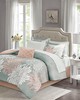 | Madison Park Essentials Twin 1 Comforter: 68"W x 86"L 1 Standard Sham: 20"W x 26"L + 2"D (1) 1 Bedskirt: 39"W x 75"L + 15"D 1 Flat Sheet: 66"W x 96"L 1 Fitted Sheet: 39"W x 75"L + 12"D 1 Standard Pillowcase: 20"W x 30"L (1) 1 Decorative Pillow: 12"W x 18"L Microfiber, printed sham and comforter, 100% polyester filling, microfiber bedskirt, 100% cotton printed sheet set, embroidered decorative pillow Transitional Style Includes 7 Piece(s) Machine Washable Spot Clean Pillow Transform your bedroom into a comfortably casual retreat with the Madison Park Essentials Maible Complete Comforter and Cotton Sheet Set. A beautiful printed floral design, in blush and white hues, adorns the grey with a cast of green ultra-soft microfiber comforter and shams, for an enchanting look. An embroidered decorative pillow and a solid blush bed skirt add chic finishing touches to the bedding set. Also included a 100% cotton sheet set with pillowcases, a flat and a fitted sheet that fits up to a 14-inch (12-inch in Twin size) mattress features a printed design that complements the comforter. Bringing the best in health and wellness, this bedding set also features an anti-microbial treatment that provides built-in freshness protection, reducing the growth of odor causing bacteria and keeps fabric lasting longer. Machine washable for easy care, this complete bed and sheet set provides a complete makeover for your bedroom decor. This bedding set may come in rolled or compressed packing and will need to be fluffed up. Use a steam iron to help remove wrinkles easier. |