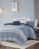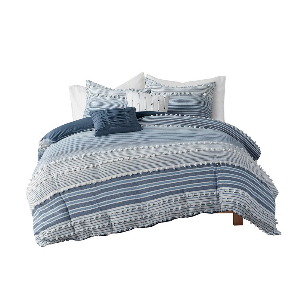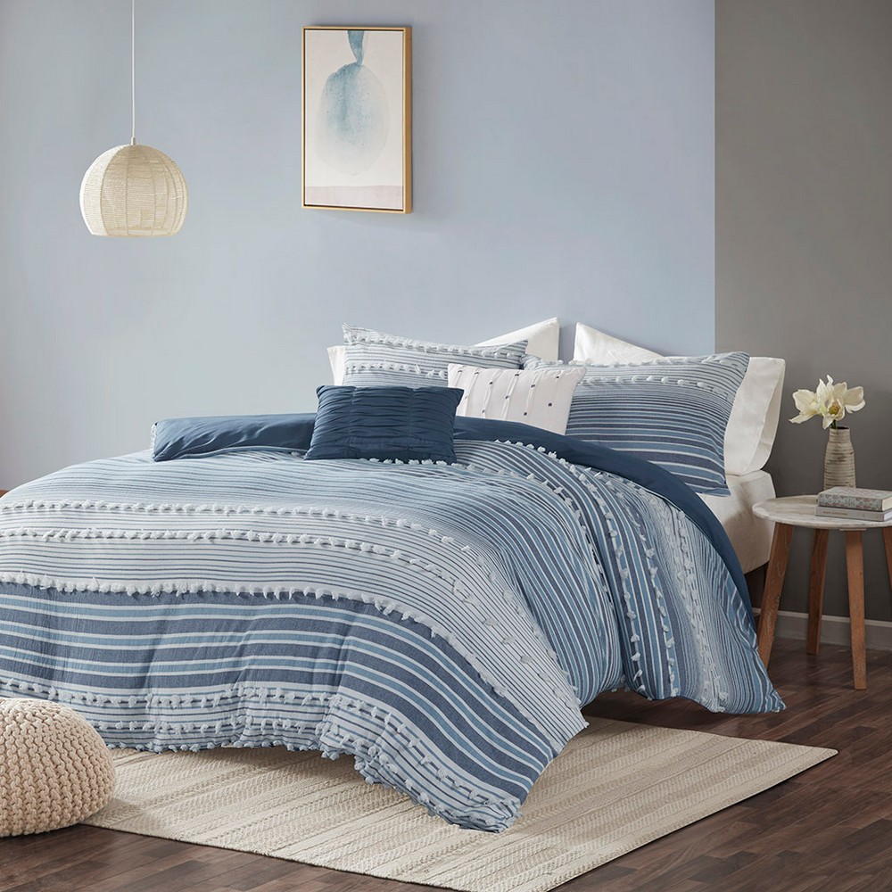 | Urban Habitat Twin/Twin XL 1 Duvet Cover: 68"W x 92"L 1 Standard Sham: 20"W x 26"L 1 Decorative Pillow: 12"W x 18"L 1 Decorative Pillow: 18"W x 18"L Duvet Cover and Sham: 100% cotton clipped yarn dye fabric on face, cotton solid reverse. Sham with overlap closure at back. Duvet cover with button closure and 4 inner ties. Pillow: 100% cotton cover, poly fill. Modern/Contemporary Style Includes 4 Piece(s) Machine Washable, Spot Clean Pillows Give your bedroom a soft casual update with the Urban Habitat Calum Cotton Jacquard Duvet Cover Set. The cotton clipped jacquard duvet cover features yarn-dyed stripes of blue, indigo, and off-white, for a soft and alluring look. Matching shams (1 for Twin Sizes) mirror the design seen on top of the bed, while two decorative pillows with hypoallergenic polyester filling add the finishing touches to the bed. This bedding set is also OEKO-TEX certified, meaning it does not contain any harmful substances or chemicals to ensure quality comfort and wellness. Easy to coordinate with, this cotton jacquard duvet cover set brings a rich textural look and feel to your bedroom decor and is machine washable for easy care. Button closures on the duvet cover secure a comforter insert (NOT included) within the duvet cover and internal corner ties prevent it from shifting. |