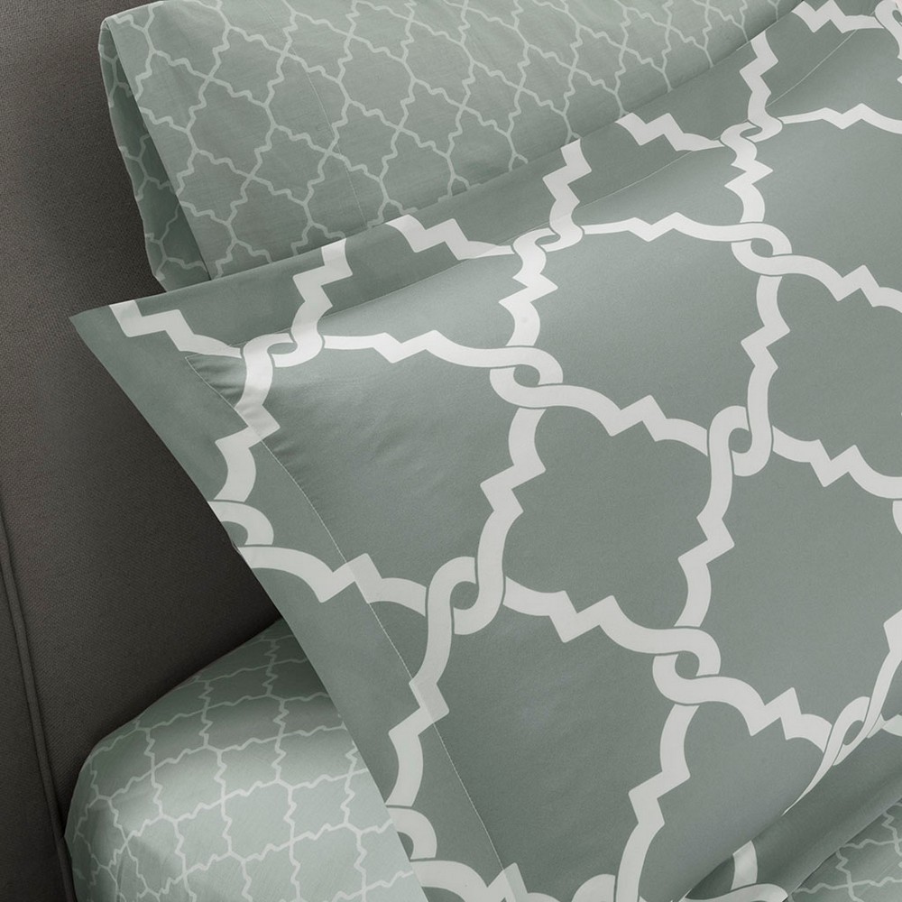 | Madison Park Essentials Twin 1 Bed Skirt: 39x75+15" 1 Pillowcase: 20x30" 1 Comforter: 68x86" 1 Flat Sheet: 66x96" 1 Decorative Pillow: 12x18" 1 Fitted Sheet: 39x75+12" 1 Standard Sham: 20x26" Microfiber, printed, comforter and shams , 7.3oz/sq yard polyester fill , microfiber bedskirt and pillow , cotton printed sheet set Transitional Style Includes 7 Piece(s) machine washable, spot clean pillow The Madison Park Essentials Merritt Reversible Complete Comforter and Cotton Sheet Set adds a simple yet chic look to your space. The comforter features a fretwork design against a vivid base that flips the color scheme on the reverse, for two distinct modern looks. Matching shams (1 in Twin Sizes) mirror the design on the face of the comforter, while an embroidered decorative pillow and solid bedskirt complete the bedding set. The included 100% cotton printed sheet set features a smaller scale fretwork pattern that complements the comforter. Bringing the best in health and wellness, this bedding set also features an anti-microbial treatment that provides built-in freshness protection, reducing the growth of odor causing bacteria and keeps fabric lasting longer. This bedding set is also OEKO-TEX certified, meaning it does not contain any harmful substances or chemicals, ensuring quality comfort and wellness. This bedding set may come in rolled or compressed packing and will need to be fluffed up. Use a steam iron to help remove wrinkles easier. |