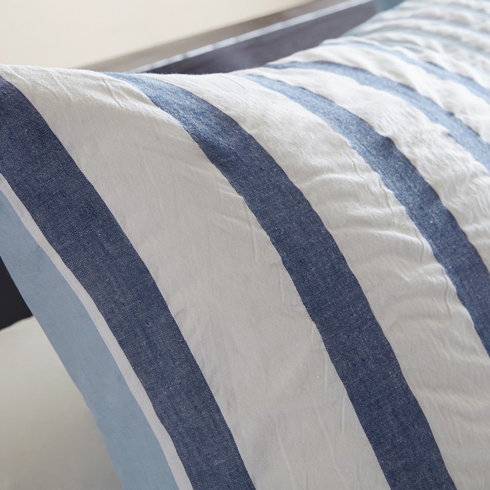 | Ink+ivy Twin 1 Comforter: 72"W x 92"L 1 Standard Sham: 20"W x 26"L Comforter & Sham: 100% cotton yarn dyed, 100% cotton percale solid revese Comforter Filling: 300 gram/sqm poly fill Style Includes 1 Piece(s) MACHINE WASH COLD, GENTLE CYCLE, AND SEPARATELY. DO NOT BLEACH. TUMBLE DRY LOW, REMOVE PROMPTLY. DO NOT IRON. IF THERE IS NO FREE MOVEMENT IN THE WASHER OR DRYER, USE LARGE CAPACITY COMMERCIAL WASHER/DRYER. The Sutton Comforter Set shows off subtle stripes in dark, medium and light blue amidst a white seersucker background. The different stripe widths along with the color variations add dimension to this clean look. The INK+IVY Collection offers a unique comforter finishing technique that offers a clean, duvet-like finish with no bar tacks on the top of the comforter. Made from yard dyed, 100% cotton, this set includes a comforter and one sham. Items in the set may come in a rolled or compressed packaging, which will need to be fluffed up or steam ironed before use to remove wrinkles. |