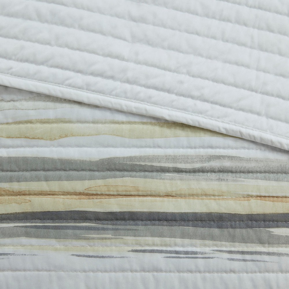 The Madison Park Marina 6 Piece Reversible Quilt Set provides a modern take on the coastal stripe. It's watercolor motif, accented with shades of yellow and gray, provides the calming feel of the beach in your space. Three decorative pillows use embroidered seashells and fabric manipulation to pull this look together.