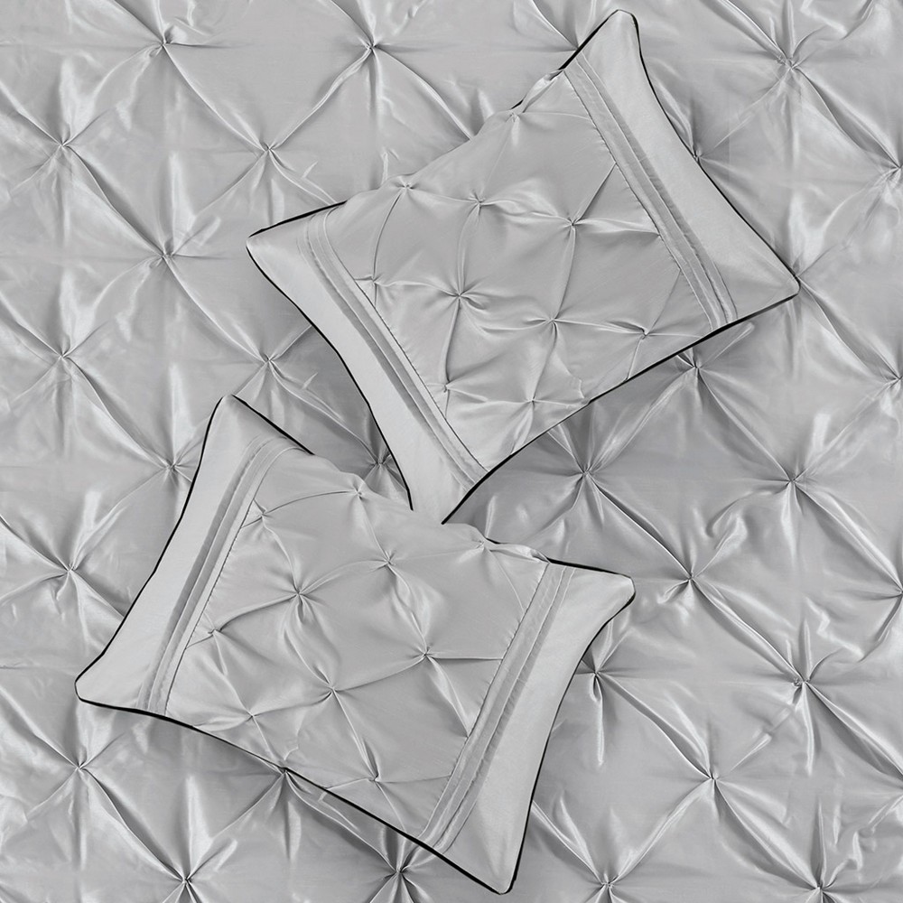 This beautifully tufted bed is from the Laurel bedding collection. Its grey coloring makes this set create a statement in your bedroom. The collection is made from 100% polyester polyoni and has pieced fabric sewn together providing added dimension. It is finished with a smooth edge of fabric that creates a beautiful border around this comforter. Items in the set may come in a rolled or compressed packaging, which will need to be fluffed up or steam ironed before use to remove wrinkles.