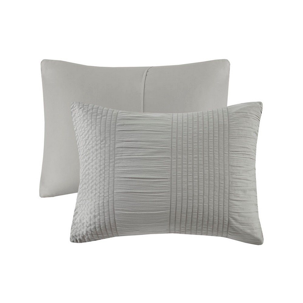 | Madison Park Essentials Cal King 1 Comforter: 104"W x 92"L 2 King Shams: 20"W x 36"L (2) 1 Flat Sheet: 108"W x 102"L 1 Fitted Sheet: 72"W x 84"L + 14"D 2 Pillowcases: 20"W x 40"L (2) Comforter/shams fabric: 100% polyester solid seersucker; Filling: 5.8oz/sqyd polyester; Sheet set fabric: 100% polyester microfiber print Casual Style Includes 7 Piece(s) Machine Washable Refresh your bedroom style with the modern allure of the Madison Park Essentials Nimbus 7 Piece Comforter Bedding and Sheet Set. The comforter features a motif of alternating solid and textured stripes to create a casual and contemporary look, while matching shams (1 in Twin) complete the comforter set. A coordinating microfiber sheet set with a simple geometric print is also included, complete with 1 flat sheet, 1 fitted sheet, and 2 pillowcases (1 in Twin). The fitted sheet fits up to a 16-inch mattress depth (14" for Twin size). Machine washable for easy care, this modern comforter set has an antimicrobial treatment that provides built-in freshness protection, inhibits growth of odor causing bacteria, and keeps the fabric newer, longer. This complete bedding set may come in rolled or vacuumed packaging; steam iron before use to remove wrinkles. |