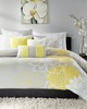 | Madison Park Full/Queen 1 Duvet Cover: 90"W x 90"L 2 Standard Shams: 20"W x 26"L (2) 1 Decorative Pillow: 18"W x 18"L 1 Decorative Pillow: 16"W x 16"L 1 Decorative Pillow: 12"W x 20"L Cotton sateen ,printed, duvet and shams ,cotton pillow with poly fill Transitional Style Includes 6 Piece(s) machine washable, spot clean pillows The Madison Park Lola 6 Piece Printed Duvet Cover Set transforms your bedroom into a beautiful and graceful space. A gorgeous floral print in a soft white and yellow hue pops against the solid taupe grey ground cotton duvet cover and shams for a stunning transitional look. Three decorative pillows with embroidered details and fabric manipulation add texture and dimension to the bed, featuring a yellow and grey stripe, a grey and yellow flowers on soft white, and a solid yellow color. A button closure secures a comforter insert within the duvet cover and inside corner ties prevent it from shifting (insert is NOT included). This bedding set is also OEKO-TEX certified, meaning it is free of any harmful substances or chemicals for your comfort and wellness. Items in the set may come in a rolled or compressed packaging, which will need to be fluffed up or steam ironed before use to remove wrinkles. |