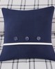 | Madison Park Essentials Cal King 1 Comforter: 104"W x 92"L 2 King Shams: 20"W x 36"L + 2"D (2) 1 Flat Sheet: 108"W x 102"L 1 Fitted Sheet: 72"W x 84"L + 14"D 2 King Pillowcases: 20"W x 40"L(2) 1 Decorative Pillow: 16"W x 16"L Soft brushed microfiber print comforter and shams, 6oz/sqyd poly fill ; 100% polyester micro fiber sheets Casual Style Includes 8 Piece(s) Machine Washable Spot Clean Pillow Restyle your bedroom with the Madison Park Essentials Patrick Reversible Comforter Set with Sheet Set. The reversible comforter and shams (1 in Twin Sizes) feature a navy plaid print on the face and a white plaid print on the reverse, for a charming casual look. A coordinating square decorative pillow adds a finishing touch to the comforter. Also included is a grey sheet set, complete with a flat sheet, fitted sheet, and 2 pillowcases (1 for Twin Sizes). Bringing the best in health and wellness, this bedding set also features an anti-microbial treatment that provides built-in freshness protection, reducing the growth of odor causing bacteria and keeps fabric lasting longer. This bedding set is also OEKO-TEX certified, meaning it does not contain any harmful substances or chemicals, ensuring quality comfort and wellness. This bedding set may come in rolled or compressed packing and will need to be fluffed up. Use a steam iron to help remove wrinkles easier. |