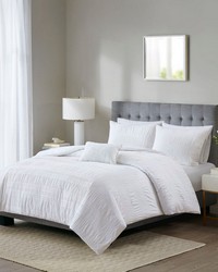 The Madison Park Nicolette 4 Piece Duvet Cover Set turns your bedroom into a cozy getaway. This seersucker duvet cover showcases a simple, yet intricate striped pattern in an elegant white hue. The textured fabric is light and soft to the touch, adding freshness and dimension to the bed. Matching shams echo the style of the duvet cover, while a decorative pillow helps complete the entire ensemble. Made from 100% cotton, this duvet cover set is machine washable for easy care.