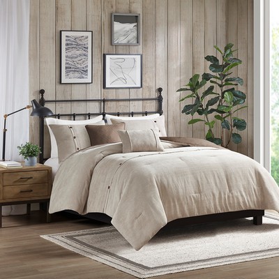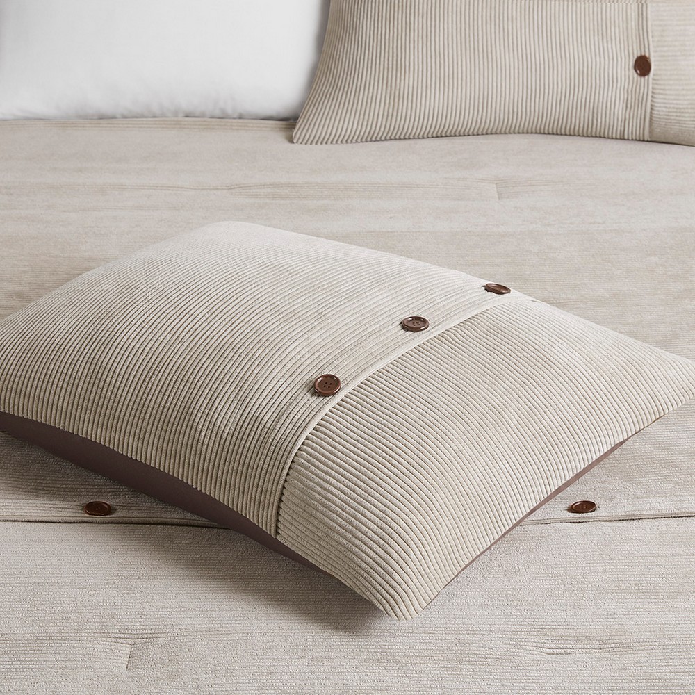 | Madison Park Full/Queen 1 Comforter: 90"W x 90"L 2 Standard Shams: 20"W x 26"L(2) 1 Decorative Pillow: 12"W x 18"L 1 Decorative Pillow: 18"W x 18"L Comforter & Sham: 100% polyester corduroy, with brushed microfiber reverse; Fabric with antimicrobial treatment Fill: 100% polyester filling Pillows: 100% polyester Transitional Style Includes 5 Piece(s) Machine Washable Pillow Spot Clean Rich texture, warmth, and elegance are yours when you add Madison Park’s Andes corduroy comfort set to your bed. Made from soft polyester corduroy, this tan comforter features decorative buttons that add a country style accent to the bed. A solid brown microfiber reverse provides additional softness, while also complementing the lush texture and dimension of the comforter face. Completed with 2 decorative pillows that flaunt quilting and piecing details, this plush comforter set gives your bedroom a cozy and inviting look. |