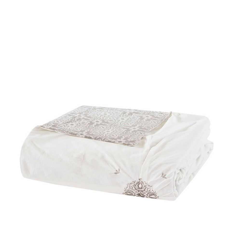 | Madison Park King/Cal King 1 Duvet Cover: 104"W x 92"L 2 King Shams: 20"W x 36"L (2) 1 Decorative Pillow: 16"W x 16"L Duvet and Sham: T144 cotton percale with over all embroidery, T180 crossweave reverse printed; Dec pillow: T180 crossweave fabric cover, poly fill Shabby Chic Style Includes 4 Piece(s) DUvet Cover/Sham: Machine Washable Pillows: Spot Clean Style your bedroom with the shabby chic allure of the Madison Park Malia 4 Piece Embroidered Cotton Reversible Duvet Cover Set. The face of the reversible duvet cover features tufted grey embroidery on an ivory base, while the reverse showcases an all-over grey medallion print that complements the top of the bed. Two matching shams mirror the face of the cotton duvet cover and an embroidered medallion design on the square decorative pillow provides an elegant finishing touch to the cotton duvet cover set. Machine washable for easy care, this reversible duvet cover set is made from 100% cotton and provides a comfortable shabby chic update to your bedroom décor. Button closures help secure a comforter insert within the duvet cover and four inside ties in the corners help prevent it from shifting (insert is NOT included). Items in the set may come in a rolled or compressed packaging, which will need to be fluffed up or steam ironed before use to remove wrinkles. |