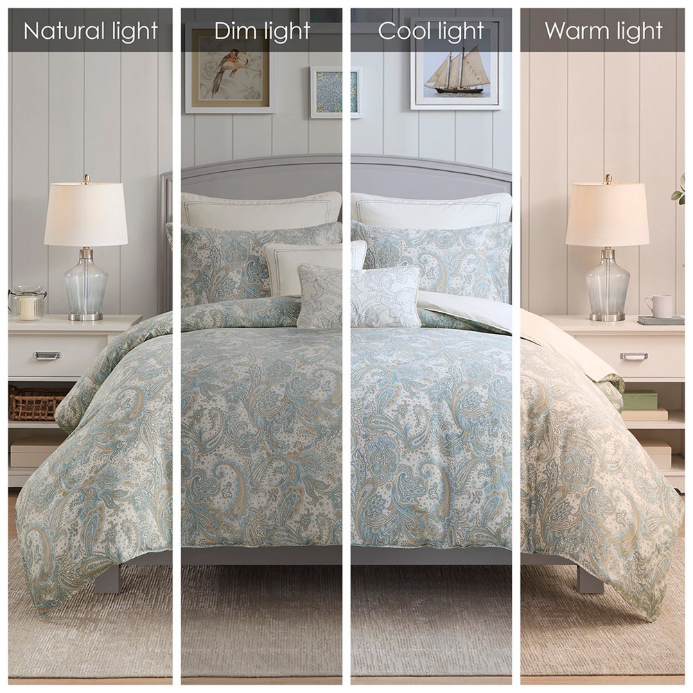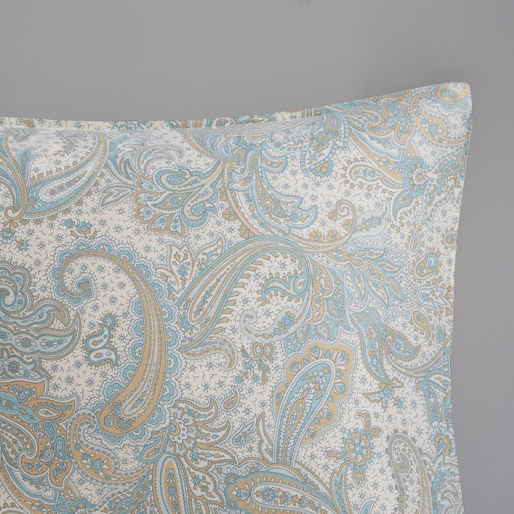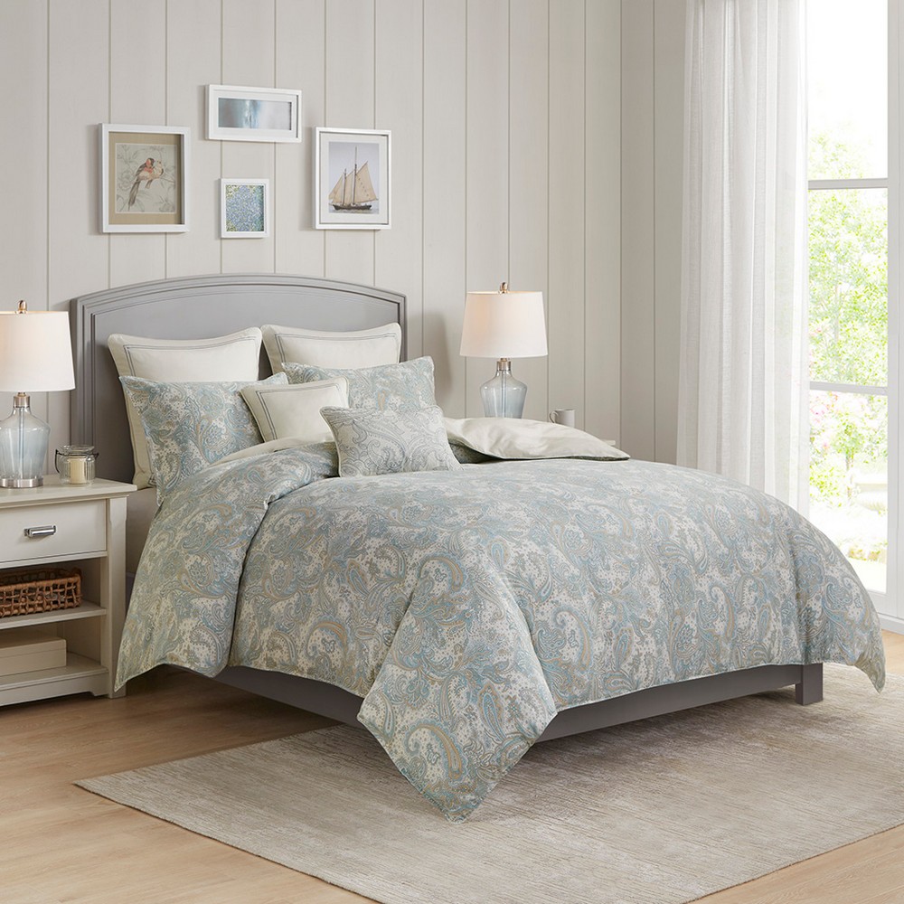 | Harbor House Full/Queen 1 Duvet Cover: 90"W x 90"L 2 Standard Shams: 20"W x 26"L (2) Face: 100% Cotton Printed; Reverse: 100% cotton percale solid Traditional Style Includes 1 Piece(s) Machine wash The Harbor House Chelsea bedding collection features a beautiful paisley print in soft blues and khaki on a soft ivory sateen fabric. This duvet set is machine washable for easy care and includes one duvet cover (insert not included) and two shams. Top off the look even more with the accessory items - Euro shams and decorative pillows which are sold separately. This bedding set is also OEKO-TEX certified, meaning it does not contain any harmful substances or chemicals, ensuring quality comfort and wellness. |