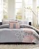 | Madison Park King/Cal King 1 Duvet Cover: 104"W x 92"L 2 King Shams: 20"W x 36"L (2) 1 Decorative Pillow: 18"W x 18"L 1 Decorative Pillow: 16"W x 16"L 1 Decorative Pillow: 12"W x 20"L Cotton sateen, printed duvet, cotton/polyester pillows Transitional Style Includes 6 Piece(s) Machine Washable Spot Clean Pillows The Madison Park Lola 6 Piece Printed Duvet Cover Set transforms your bedroom into a beautiful and graceful space. A gorgeous floral print in a soft white and peach hue pops against the solid grey ground cotton duvet cover and shams for a stunning transitional look. Three decorative pillows with embroidered details and fabric manipulation add texture and dimension to the bed, featuring a peach and grey stripe, a grey and peach flowers on soft white, and a solid peach color. A button closure secures a comforter insert within the duvet cover and inside corner ties prevent it from shifting (insert is NOT included). This bedding set is also OEKO-TEX certified, meaning it is free of any harmful substances or chemicals for your comfort and wellness. Items in the set may come in a rolled or compressed packaging, which will need to be fluffed up or steam ironed before use to remove wrinkles. |