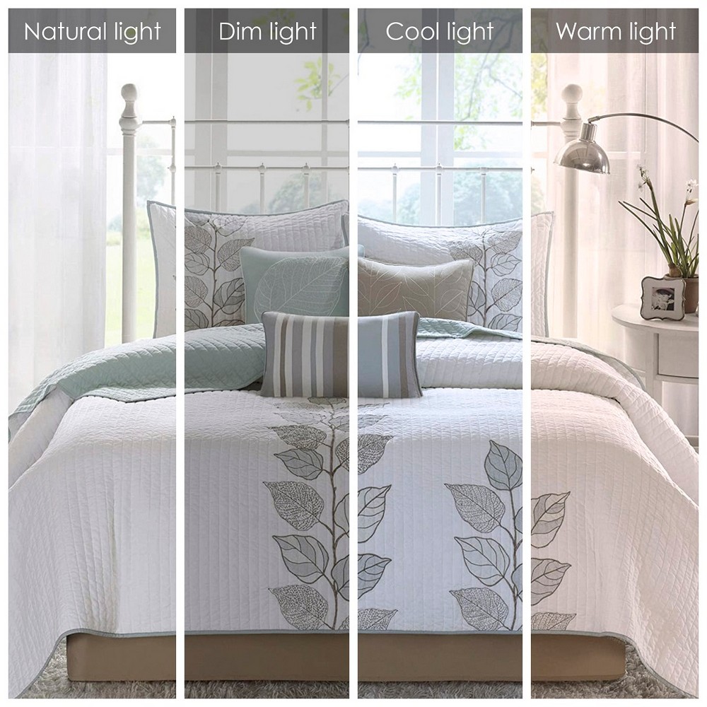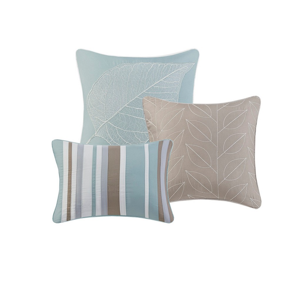 This beautiful 6 Piece Reversible quilt set is a classic stylish look with an embroidered leaf print. Caelie is blue and white with subtle stripes that add texture. The quilt reverses to a soft blue. With a microfiber polyester face and a brushed fabric reverse, this quilt is soft to the touch and machine washable for easy care. Two matching standard shams and three embroidered decorative pillows complete the look. Queen size features two rows of embroidery, King size features three rows. Items in the set may come in a rolled or compressed packaging, which will need to be fluffed up or steam ironed before use to remove wrinkles.