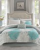 | Madison Park Essentials Queen 1 Comforter: 90"W x 90"L 2 Standard Shams: 20"W x 26"L + 2"D (2) 1 Bedskirt: 60"W x 80"L + 15"D 1 Flat Sheet: 90"W x 102"L 1 Fitted Sheet: 60"W x 80"L + 14"D 2 Standard Pillowcases: 20"W x 30"L (2) 1 Decorative Pillow: 12"W x 18"L Microfiber, printed sham and comforter, 7.3oz/square yard polyester filling, microfiber bedskirt , 100% cotton printed sheet set, embroidered decorative pillow Transitional Style Includes 9 Piece(s) Machine Washable Spot Clean Pillow Transform your bedroom into a comfortably casual retreat with the Madison Park Essentials Maible Complete Comforter and Cotton Sheet Set. A beautiful printed floral design, in aqua and white hues, adorns the grey with a cast of green ultra-soft microfiber comforter and shams, for an enchanting look. An embroidered decorative pillow and a solid grey bed skirt add chic finishing touches to the bedding set. Also included a 100% cotton sheet set with pillowcases, a flat and a fitted sheet that fits up to a 14-inch (12-inch in Twin size) mattress features a printed design that complements the comforter. Bringing the best in health and wellness, this bedding set also features an anti-microbial treatment that provides built-in freshness protection, reducing the growth of odor causing bacteria and keeps fabric lasting longer. Machine washable for easy care, this complete bed and sheet set provides a complete makeover for your bedroom decor. This bedding set may come in rolled or compressed packing and will need to be fluffed up. Use a steam iron to help remove wrinkles easier. |