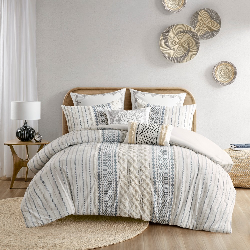 Imani Cotton Printed Comforter Set with Chenille White Navy Full Queen